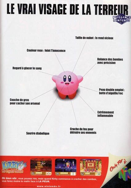 Pas de sentence à prévoir, c'est vrai que le look de Kirby est particulier, moi j'aime bien ce côté guimauve attachante. Par contre, pour sa défense, je dirais que son pouvoir d'absorption est un régal et mérite qu'on dépasse le design bubblegum, rien qu'une fois.
