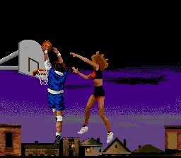 Voici un jeu de basket de rue qui permet uniquement des matches en 1 contre 1. Ca commence mal. On choisit son perso parmis 2 gars et 1 fille (donc 3 possibilités) et on essaie d'effacer son adversaire qui se trouve entre nous et le panier pour placer un tir ou aller dunker. Les boutons de la manette servent à tirer, à faire des feintes ou à pousser l'adversaire quand on a pas la balle. Lorsqu'on place un dunk, ce dernier est représenté par une animation plein écran. Les graphismes digitalisés sont grossiers et de mauvais gouts, tout comme les insultes que délivre péniblement les sons produits par le jeu. La jouabilité est approximative et l'intérêt est proche du zéro absolu. Même si vous pensez qu'il peut être fun de se faire du 1 contre 1 (et vous n'avez pas tort, nostaliques que vous êtes de "Dr J vs Larry Bird" sur Apple2 !!), mieux vaut vous consacrer au mode One on One de Dream Basketball présenté en page 24. 0.5/5