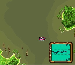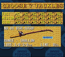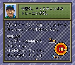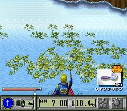 Ce jeu de pêche en "jette" beaucoup moins que Japan Bass (parce qu'il y a moins de sponsors ?). Moins joli et surtout ne disposant pas du quart des options de ce dernier, il a toutefois l'avantage d'être sorti en version US et donc en anglais. Ceci dit, les menus et, d'une manière générale, les textes à l'écran sont tellement peu nombreux que ça ne fera pas beaucoup de différence. Après avoir choisit le lac ou on veut pêcher (en mode entrainement, on les fait dans un ordre précis en mode tournoi), on déplace son bateau vers l'endroit ou on va lancer sa ligne. Précison que le bateau est un hors-bord dernier cri : on fait de la pêche sportive ici ! Ensuite on jette sa ligne, et on attend. Quand le poisson mord, il faut le remonter en faisant preuve de doigté en jouant de la croix pour incliner sa ligne et du bouton A pour mouliner. Contrairement à quasiment tous les autres jeux du genre vus jusqu'ici, la vue ne montre pas le poisson (que ce soit sous l'eau ou de dessus comme Japan Bass) : la caméra reste fixe derrière le pêcheur. C'est d'une part plus réaliste, mais d'autre part ça enlève du dynamisme et du "spectacle" à un genre de jeu qui n'en dispose déjà pas de beaucoup à la base ! Une remarque à propos de la version japonaise (dont les menus sont quasi tous en anglais) qui dispose de plus d'options. Ainsi on peut choisir sa canne à pêche parmis plusieurs modèles ce qui n'est pas possible dans la version US (ou alors je n'ai pas trouvé comment).