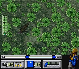 Ce jeu montre d'entrée son sérieux en affichant lors de l'intro la liste des licences officielles dont il dispose : associations de pêcheurs, marques de canne à pêche, marques de bateaux, magazines de pêche ... etc ... L'impression d'avoir à faire à un poids lourd du genre ne s'estompe pas quand on passe au jeu lui même qui est graphiquement très réussi et qui semble être une véritable simulation prenant énormément de critères en compte. Le mode entrainement permet d'ailleurs de se rendre compte de la complexité de la chose. On peut ainsi s'entrainer à lancer sa ligne dans des cibles dessinées sur l'eau, et il faut prendre en compte la vitesse du vent et bien calculer la force de son coup pour réussir. Ensuite, dans la phase de remontée de la prise, il faut bien gérer la position du pêcheur (toujours représenté à l'écran), relâcher la ligne quand elle risque de casser, attirer le poisson ou il a le moins de chance de s'échapper ... etc ... Bien que tout soit en japonais, le tout est assez jouable, mais vraiment complexe par rapport à d'autre titres du genre. Apparement c'est une valeur sure pour qui souhaiterais s'essayer aux jeux de pêche. Jimmy Houston's Bass Tournament U.S.A. / Jissen! Bass Fishing Hisshouhou in USA (Sammy - 1995)