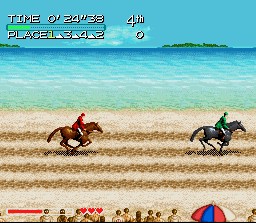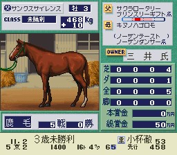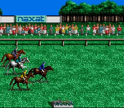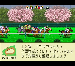 Enfin un jeu d'équitation ou on peut controller ces sacrés canassons ! Ici il est question de bâtir une écurie à succès, en commençant par acheter un cheval et en lui faisant disputer diverses épreuves. Certaines sont de simples courses pendant lesquelles il faudra gérer au mieux l'endurance de l'animal et d'autres sont des courses d'obstacles ou il faudra sauter au bon moment (bouton B) et également essayer de faire ramasser des bonus par le jockey (boutons L et R). La représentation se fait de coté avec des graphismes sympathiques et une bonne animation même si le petit temps d'arrêt que marque le cheval avant de sauter me semble peu naturel. Il faut dire que la cartouche embarquait la puce SA-1 qu'on retrouve dans de "gros" jeux comme DBZ Hyper Dimention ou Super Mario RPG, ce qui n'est pas sans entrainer des problèmes d'émulation (voir plus loin). S'il est agréable de pouvoir enfin "conduire" un cheval après toutes ces simulations de tiercé ou on était simplement spectateur, il faut bien dire malgré tout que ce jeu ne plaira qu'aux passionés de la discipline. Le rythme est en effet très lent et il peut se passer de très longues dizaines de secondes sans que rien ne se passe à l'écran pendant une course. De nombreuses options sont disponibles à partir de l'écurie ou l'on peut effectuer différents choix mais les menus en japonais ont freiné mes explorations. Si vous voulez vous essayer au jeu, il faudra trouver l'émulateur qui va bien (ou la cartouche, c'est presque plus simple ici) car Zsnes n'affiche pas certains graphismes pendant les menus et plante régulièrement quand on revient à l'écurie, tandis que Snes9X affiche une bouillie de pixels en lieu et place des sprites. Je n'ai pas essayé sur les émus Wii/Xbox/psp ...