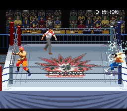 Etant à la fois fan de catch et fan des productions Konami (surtout celles de cette époque), je ne pouvais qu'être très réceptif à ce jeu dont je n'avais pourtant jamais entendu parler jusqu'ici. Il s'agit donc d'un jeu de catch proposant une cinquantaine de personnages fictifs plus ou moins copiés sur de vrais catcheurs. Certains sont très reconnaissables comme Atsushi Onita ou Great Muta, d'autres sont simplement "inspirés par" comme l'un ressemblant à Hulk Hogan. Mais il y a aussi des persos qui font référence à d'autres jeux Konami comme Bill et Lance de Contra, Goemon ou ces catcheurs masqués qui portent les couleurs de vaisseaux de Gradius. Ce mélange improbable pourrait laisser penser qu'on a à faire à un jeu déjanté, très arcade et avec des coups spéciaux de la mort ... eh bien c'est tout le contraire ! Le gameplay est calqué sur celui de la série Super Fire Pro Wrestling (ou Gekidou Burning Pro Wrestling présenté en page 42) avec un système de choppe basé sur le timing et des coups réalistes et animés fidèlement. Le coups sont hélas très loin d'être aussi nombreux que dans les 2 exemples cités mais on trouve cependant des possibilités qui n'existent pas (pas encore) ailleurs comme le fait de mettre un adversaire à genoux, de l'attacher dans les cordes ou de faire des plongeons de la 3ème corde vers l'extérieur du ring. Les commandes de base sont Y, B et A pour faire des coups respectivement faibles, moyens et forts (avant ou après avoir choppé), X pour chopper son adversaire ou grimper sur la 3ème corde, R pour courir et L pour le tombé. Le seul coté "fantaisiste/improbable" pourrait être le mode "deathmatch" dans lequel les cordes sont remplacées par des fils barbelés électrifiés et ou le ring est entouré d'explosifs, mais ce serait oublier que ces matches ont REELLEMENT et fréquemment eu lieu au Japon dans les années 90 ! Notons que Jikkyou Power Pro est le 1er jeu de catch à présenter ce mode qu'on retrouvera ensuite dans la série des Fire Pro. Plus classique, on trouve également un mode "shootfighting" qui reproduit des combats de type MMA avec un système de rounds et de points. Autre mode de jeu à souligner : le mode "Max voltage" qui permet de créer un jeune catcheur débutant et de suivre toute sa carrière. Il faudra faire quelques choix au niveau de son entrainement, répartir des points, plus tard changer sa panoplie de coups ou son costume en fonction de ce qu'on débloque, et surtout survivre sur le ring. Ce mode a l'air très interessant mais bien entendu tout est en japonais. Il existe un patch de traduction pourtant (incomplet) mais son application a provoqué plus de bugs qu'autre chose sur mes émus. Avant de passer à la réalisation, un mot sur les modes multijoueurs : il est possible de jouer à 4 joueurs humains simultanément et de faire des matches en tag jusqu'à 6 catcheurs (3 contre 3) mais malheureusement il n'y a jamais plus de 2 catcheurs simultanément en action, ce qui veut dire que les prises en équipes sont impossibles (dès qu'un catcheur "tag" son partenaire il quitte immédiatement le ring). Du coup, pas de mode "battle royale" non plus. La réalisation a surrement du faire parler d'elle à l'époque puisque les graphismes sont des modèles 3D qui ont été digitalisés en 2D, comme Donkey Kong Country. Mais il faut reconnaitre que le résultat est loin d'être aussi bon que le soft de Rare et que le rendu passe plutot mal de nos jours. Les sprites rondouillards de Gekidou Burning Pro Wrestling ont beaucoup mieux vieillis. Par contre, l'ambiance sonore est très bonne grâce entre-autre aux fameux commentaires audio ("Thandaaa fayaaa bombeuuuu !!"). Bref, le jeu est très bon mais j'ai vraiment beaucoup de mal à accrocher aux graphismes. De plus je trouve que la façon de jouer du CPU est d'une part moins fidèle à la réalité (pour les catcheurs tirés de vrais athlètes, évidemment, parce qu'on avait encore pas vu le Vic Viper catcher !!) que dans Fire Pro et d'autre part ce même CPU est parfois complètement à la ramasse, par exemple il lui arrive d'oublier pendant les "deathmatch" que les cordes sont électrifiées et il se lance de lui même dedans ! Enfin, le feeling général semble plus orienté vers une jouabilité nerveuse et spectaculaire que sur la volonté de reproduire un match de façon ultra fidèle. Notez que ce dernier point sera plus une qualité qu'un défaut suivant vos gouts en jeux de catch. A essayer en tout cas, mais attention il ne passe pas sous Zsnes. 3/5