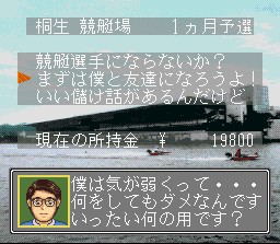 Dans ce jeu on fait des paris sur des courses de bateaux, malheureusement non-interractives. Jouable à 4 simultanément, le jeu dispose également d'un mode story dans lequel on rencontre des personnages (parmis lesquels les pilotes de bateaux) et ou on est amené à faire quelques choix lors de dialogues. Tout étant en japonais, il m'est difficile d'en dire plus sur ce mode. Techniquement c'est très moyen. Le mode story affiche des illustrations très moches tandis que les courses de bateaux ne sont pas graphiquement superbes mais affichent de nombreuses vues mettant en valeur le déroulement de la course qui est commentée par des voix digitalisées de bonne facture.