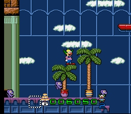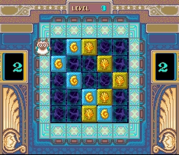 Ce puzzle game à la réalisation correcte a le mérite de proposer un principe original et bien corsé. On dirige un personnage vu de dessus qui marche sur un plateau de jeu ou sont disposées des pièces qu'il doit faire disparaitre en les alignant par 3 (ou plus) horizontalement ou verticalement selon leur couleur ou leurs illustrations. Pour celà on peut pousser, tirer et sauter par dessus les pièces. 2 modes de jeu principaux sont proposés. D'abord le mode puzzle ou il faut passer plusieurs niveaux à la façon de Puzznic en faisant disparaitre toutes les pièces présentes. Les configurations sont bien entendu de plus en plus complexes avec des objets spéciaux qui font vite leur apparition. Ensuite il y a le mode "endless" ou des pièces apparaissent aléatoirement autour du personnage et il faut les faire disparaitre le plus vite possible avant que tout le tableau ne soit enhavit. Ce mode devient vite assez difficile et on se retrouve débordés par la vitesse à laquelle finissent inmanquablement d'apparaitre les pièces. Ce mode est également jouable à deux, soit en coopération, soit en versus : les 2 joueurs sont ensemble sur le même tableau mais ont 2 scores séparés et c'est à celui qui aura fait disparaitre le plus de pièces lors du game-over. Un très bon casse-tête que je recommande chaudement d'essayer. Il est injustement méconnu et n'a semble-t-il bénéficié que d'une re-sortie sur Playstation (là aussi en restant très confidentiel). Petite remarque : je trouve que le sprite de la bestiole qu'on dirige par défaut (il est possible de le remplacer dans le options par un petit garçon ou une petite fille) ressemble énormément à un des premiers ennemis rencontrés dans le RPG Chrono Trigger. J'ignore s'il s'agit d'un hasard. 3.5/5 Ce jeu est évoqué sur Grospixels dans cet article sur les jeux de réflexion : http://www.grospixels.com/site/reflex.php Krusty Super Fun House (Audiogenic / Acclaim - 1992)