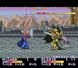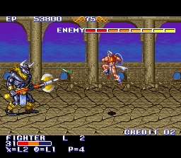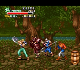 Ces 2 classiques du beat-them-all Capcom, à l'image de Captain Commando (page 15) et Final Fight (page 33) sont de bons jeux en version Snes mais leurs qualités ludiques et techniques sont clairement en retrait par rapport aux bornes d'arcade qu'on trouve désormais émulées (quasi) parfaitement dans des compilations comme Capcom Classics Collection vol 2 sur PS2 et Capcom Classics Collection Reloaded sur PSP. Jouable à 2, Knights of the Round se sert de la légende Arthurienne comme toile de fonds et permet aux joueurs de controller Arthur, Lancelot ou Perceval. On peut frapper, sauter, se mettre en garde (une technique qui permet, si on bloque un coup au bon moment, de bénéficier de quelques petites fractions de seconde d'invincibilité), d'utiliser une super attaque qui consomme de la vie et de frapper un "gros coup", plus lent mais avec une meilleure portée et faisant plus de dégats (mettre une direction juste après avoir attaqué). Notons que le jeu est moins technique qu'en arcade avec un bouton dédié à la garde et que cette dernière est plus facile à utiliser. Graphiquement, bien que ce soit correct, on perd beaucoup en finesse par rapport à la borne et, surtout, de nombreux éléments sont absents, dont les chevaux sur lesquels on pouvait monter pour combattre. Jouable à 2 également, King of Dragons se déroule dans un très classique univers d'heroic-fantasy comme Golden Axe dans le même genre. Les mouvements disponibles sont frapper, sauter, utiliser un bouclier (ce qui est possible avec un bouton dans la version Snes, comme pour Knights of the Round, ce qui rend son utilisation plus facile ici aussi) et utiliser un coup spécial consommant de la vie. La palette de coups est quand même assez limitée par rapport à la concurrence. Pour compenser, 5 persos sont disponibles et se jouent assez différemment, certains ayant des attaques touchant à distance (le mage, l'archer), d'autres étant plus à l'aise au contact. La magie est présente dans ce jeu sous la forme de bonus dans lesquels il faut frapper pour déclencher le sort. L'astuce est d'essayer de déplacer les bonus (en les poussant) sans frapper pour les utiliser aux endroits opportuns. A noter que le jeu est vraiment dur et a contribué à la mauvaise réputation de "bouffeur de pièces" que le genre s'est vu attribuer en arcade. On n'aura pas ce problème sur la version Snes, qui est d'ailleurs plus facile, mais on perdra pas mal d'intérêt à cause de la réalisation en demi teinte avec de très petits sprites et encore une fois l'absence de certains éléments graphiques. En bref, ce sont 2 jeux assez sympathiques sur lesquels on ne va pas forcément s'attarder car il est possible facilement de s'adonner aux versions arcade qui sont bien suppérieures à leurs adaptations Snes. Ceci dit, le fait de pouvoir, dans ces 2 jeux, utiliser la défense avec un bouton au lieu d'une manipulation hasardeuse et milimétrée en arcade (surtout pour King of Dragon, c'est quasi impossible) peut interesser les fans souhaitant exploiter cette technique à fonds pour espérer faire tout le jeu avec un seul crédit (bonne chance ...). 2.5/5 (3/5 si vous n'avez pas moyen de jouer aux versions Arcade) Knights of the Round version arcade bénéficie d'un petit article sur GP ici : http://www.grospixels.com/site/knightsround.php ainsi que d'un topic de discussion ici : http://www.grospixels.com/phpBB/viewtopic.php?topic=12832&forum=1