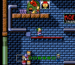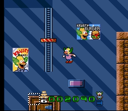 Mélange de puzzle-game et d'action, ce jeu met en scène le clown célèbre de la série The Simpsons qui, pour une raison inconnue, doit parcourir plusieurs tableaux dans lesquels il doit éliminer des rats. Pour se faire, il doit trouver un moyen d'acheminer les rongeurs vers une machine qui mettra fin à leur existence d'une façon qui empêche d'affirmer qu'aucun animal n'a été maltraité pendant la réalisation de ce jeu. Les rats avancent toujours tout droit comme les Lemmings du jeu du même nom et Krusty doit utiliser des blocs trouvés en route pour les faire aller ou il veut. Mais ce n'est pas la fin du niveau pour autant car le clown doit ensuite revenir à la porte d'entré et le chemin est souvent parsemé d'embuches. Krusty peut cependant sauter et tirer des projectiles trouvés en route sur les ennemis. Attention à ne pas appuyer par inadvertance sur le bouton SELECT, ce dernier nous fait perdre une vie et recommencer le niveau en cours si on est bloqué. Le jeu n'est franchement pas joli, et on lui reprochera également une maniabilité un peu discutable avec par exemple l'utilisation de la direction "bas" du joypad pour prendre et déposer un bloc (maniabilité héritée de la version micro-ordinateurs). Mais tout celà reste jouable et amusant, et Krusty est un jeu sympathique que je recommande d'essayer. Perso j'aime assez, même si les niveaux finissent par tous se ressembler, ce qui fait que je ne l'ai jamais terminé, et il faut admettre que le game design des phases d'action pure s'éssoufle rapidement. Pour l'anecdote, le jeu est né sur Amiga : il s'appelait alors "Rat Trap" et ne disposait pas de la license Simpsons. On se rend d'ailleurs bien compte à quel point la license a été collée "à l'arrache" sur ce jeu en remplaçant un sprite par un autre et en collant des posters "Simpsons" dans les décors de façon très maladroite. 2/5
