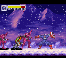 Réunissant plusieurs héros de la licence Marvel qui doivent retrouver les "gemmes de l'infini" avant que les super-vilains ne s'en emparent, ce titre jouable en solo uniquement offre un gameplay qui mélange le beat-them-all sur un seul plan et la plate-forme. On commence par choisir l'un des 3 premiers niveaux accessibles dès le départ (plus un niveau d'entrainement) puis un héros parmis Wolverine/Serval, Spiderman, Ironman, Hulk et Captain America. Chaque perso a ses propres caractéristiques (plus ou moins rapide, fort, résistant ...) et ses coup spéciaux qui se déclenchent avec des manipulations comme des quarts de cercle ou 2 directions suivies d'un bouton. Dans tous les cas, on n'utilise que 2 boutons : frapper et sauter. Les décors des niveaux sont variés avec paysages enneigées, forêts, chateaux forts, forteresses futuristes ... mais ils sont tous très courts, même si certains proposent plusieurs chemin en fonction du héros choisit. Ainsi, Ironman (de loin le meilleur perso) pourra accéder à des zones en hauteur grâce à son double-saut, contrairement à Hulk. A la fin de chaque niveau, on affronte un boss (un super villain ou un clone maléfique des héros) avant de revenir au QG permettant de choisir le lieu ou aller ensuite. Chaque bonus trouvé en chemin peut être assigné ensuite à un héros pour le booster.