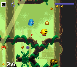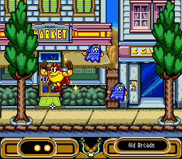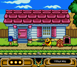En 1993 sortait sur Amiga un excellent jeu de plate-forme nommé Fury of the Furries (voir l'article sur GP). Un an plus tard, les développeurs (français) font un petit tour chez Namco et adaptent leur jeu pour la Snes en remplaçant les boules de fourrures du soft initial par le célèbre Pacman. Les graphismes et sons sont donc entièrement revus, tout comme les niveaux qui sont différents, mais le principe reste le même, avec quelques ajouts. Pacman doit traverser plusieurs niveaux, et plusieurs époques, pour rentrer chez lui retrouver sa famille. Il doit pour celà ramasser toutes les pac-gommes et trouver la sortie de chaque stage. De nombreux monstres et pièges se dressent sur sa route mais Pacman a de la ressource. Il dispose en effet de 4 pouvoirs qu'il doit acquérir dans chaque niveau en passant à travers des portails circulaires. Il y a le pouvoir permettant de lancer des boules de feu, celui qui le fait nager sous l'eau et cracher des bulles sur les ennemis, le marteau qui détruit certains murs et plate-formes (et remplace la boule rouge teigneuse de Fury of the Furries), et enfin (surtout !) l'indispensable grappin qui permet de s'accrocher partout et autour duquel est articulé une grande partie du game-design. Pacman peut également courir et sauter, et attention car il est victime d'inertie et a tendance à rebondir violemment quand il percute un obstacle. Enfin, les fantomes du jeu d'arcade font également des apparitions et on ne pourra s'en débarasser qu'en ramassant d'abord une super pac-gomme. Pac in Time est un excellent jeu, prenant et proposant des situations originales. L'utilisation du grappin est particulièrement jouissive et, passé un petit temps d'adaptation, on se surprend à se déplacer quasi-exclusivementà la Spiderman en s'accrochant partout plutot qu'en marchant. Si vous avez aimé Fury of the Furries sur Amiga (si ce n'est pas le cas : qu'est-ce qui ne va pas chez vous ?!?), foncez les yeux fermés. Certes les excellentes musiques de la machine de Commodore ont disparues mais on trouve à la place des thèmes repris d'autres jeux Pacman (comme Pacmania) et remixés, et les sprites sont beaucoup plus gros ici (mais les graphismes manquent un peu de charme je trouve). BIEN Pacman 2 : The New Adventures / Hello Pacman (Namco - 1994)