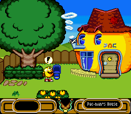 La représentation du jeu, façon side-scroller, fait penser à Pacland, mais le gameplay est totalement différent. Nous n'avons pas à faire à un jeu de plate-forme mais plutot à un puzzle-game qui lorgne même du coté du jeu d'aventure. Pacman, qui doit accomplir diverses "missions" pour résoudre les petits tracas de sa famille, avance tout seul dans le décor. Le joueur controlle un viseur qui permet d'envoyer des pierres sur des éléments du décor. En touchant le bon objet/personnage/animal au bon moment, on déclenche des scènes qui permettent de faire progresser l'histoire comme par exemple attirer l'attention de Pacman pour qu'il déclenche des actions. Ces actions seront différentes en fonction de l'humeur du héros, et cette humeur varie selon les événements qui se produisent. Par exemple, si Pacman a pris peur parce qu'un chien s'en est pris à lui, il refusera d'aller attraper un objet et il faudra trouver un moyen de le mettre de bonne humeur en déclenchant une animation amusante ou en attirant son attention sur un élément sympathique du décor. On peut également envoyer parfois des super-pac-gommes qui transforment le héros en "super pacman" (avec le masque et la cape de super-héros !) : il se met alors à voler et peut traverser plusieurs obstacles sans soucis ou bien, vous l'aurez deviné, manger les fantômes lorsque ces derniers apparaissent. Il est également possible de faire changer pacman de direction en lui disant de regarder vers la gauche ou la droite. Tout ceci donne un gameplay subtil et complexe et rend le jeu plutot original. Certains niveaux sont cependant plus axés sur l'action et on doit alors assurer la survie de Pacman dans sa progression suivant un scrolling forcé en tirant sur des éléments du décor qui pourraient le blesser. Enfin, il est possible de se rendre dans une salle d'arcade de la ville pour jouer au vrai jeu Pacman de 1980. La réalisation est vraiment réussie grâce à des animations détaillés, très nombreuses et souvent très drôles, et des graphismes colorés. Le seul défaut du jeu est qu'il est parfois difficile de comprendre / deviner ce qu'il faut faire et que le jeu donne très peu d'indications. L'aventure est également assez courte. Quoi qu'il en soit, c'est un titre qui sort des sentiers battus, à découvrir. ASSEZ BIEN