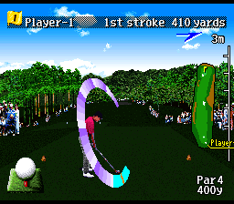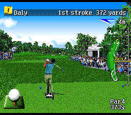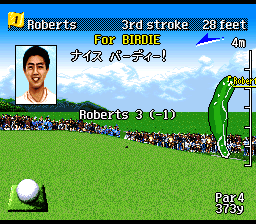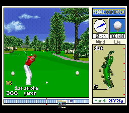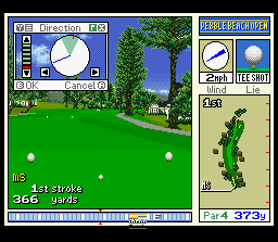 Ce jeu de golf assez soigné est une version occidentale du 1er Harukanaru Augusta vu en page 49. Comme ce dernier, il dispose de graphismes réaliste en pseudo 3D qui mettent un certain temps à s'afficher quand on décide de changer la direction vers laquelle on veut frapper la balle. La jouabilité est classique avec l'habituelle barre de puissance et, petite particularité de la série, un curseur qui se déplace très vite à arrêter au bon moment sur sa balle pour avoir le point d'impact idéal lors de la frappe. Comme le titre du jeu l'indique, c'est le célèbre et magnifique cours de golf de Pebble Beach en Californie qui est mis en vedette dans ce titre. Bien que jouable et amusant, le style graphique réaliste du jeu fait qu'il vieillit moins bien que d'autres titres plus "cartoonesques" de la console et on préfèrera logiquement s'adonner à des versions plus modèrnes de ce type de jeu. MOYEN Pebble Beach no Hotou New : Tournament Edition (T&E Soft - 1996)