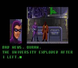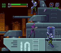 Tiré d'un dessin animé, lui-même adapté d'un comics américain des années 30, Phantom 2040 est un jeu d'action/aventure avec un personnage vu de profil qui doit explorer toute une ville en vue de rassembler des indices pour son enquête et coincer quelques super-villains. On se déplace donc assez librement dans les niveaux du jeu dans lesquels on fait face à de nombreux pièges et ennemis. Le héros peut sauter, s'abaisser, courir, donner des coups de poing et utiliser toute une panoplie d'armes et de gadgets à faire rougir de jalousie l'ami Batman. En début de partie, il s'agit d'un pistolet et d'un grappin permettant de s'accrocher un peu partout. Le déroulement du jeu est semi-linéaire. A partir d'une carte on choisit sa prochaine destination et de plus en plus de niveaux deviennent disponibles en même temps que l'histoire progresse. Il est possible de faire certains niveaux dans l'ordre qui nous plait, de revenir en arrière après avoir débloqué des passages (souvent vers des bonus) et d'explorer à loisir chaque endroit. Le coeur du gameplay reste un action/plate-former à mi chemin entre Contra et Metroid. Assez bien réalisé, malgré un design sans éclat, et jouable, bénéficiant de cut-scenes soignées pour faire progresser l'histoire, Phantom 2040 est un titre qu'on aurait tort de laisser de coté sous pretexte qu'il est tiré d'une obscure licence et n'est pas réalisé par un grand nom du genre comme Sega ou Konami. Bien qu'un peu trop difficile et disposant de passages parfois mal fichus, c'est une bonne surprise en ce qui me concerne. Notons que la version euro s'est vue emputée des cut-scenes. ASSEZ BIEN