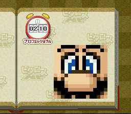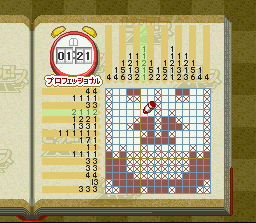 Qu'est-ce que le Picross ? C'est un jeu de réflexion né dans les pages de quotidiens japonais entre le sudoku et les mots croisés. Le principe est le suivant : sur une feuille quadrillée, de plus en plus grande en fonction de la difficulté, se trouve un dessin qu'il faut faire apparaitre en noircissant certaines cases, comme pour faire du pixel-art (ou du point de croix, tout simplement). Pour savoir quelles cases noircir, des chiffres se trouvent autour de la feuille et indiquent le nombre de cases composant le dessin pour chaque ligne et chaque colonne. Les cases représentées par ces chiffres se suivent toujours. Si plusieurs chiffres sont présents, celà signifie que plusieurs suites de cases sont à noircir sur une même ligne / colonne. Et si vous avez l'impression d'avoir déjà lu ça quelque part, c'est que vous êtes des fidèles de ce blog et je vous en félicite ! Les 8 jeux ici présents sont sortis en fin de vie de la Snes, entre 1999 et 2000 et ont été distribués par l'intermédiaire du service Nintendo Power qui consiste à acheter une cartouche vierge et à ensuite aller télécharger à bas prix des softs dans certains magasins. Ils disposent tous les 8 de la même interface et des mêmes options, seuls les picross sont bien évidemment différents. Ils se répartissent selon 3 niveaux de difficulté (et de grandeur) et un mode 2 joueurs permet de jouer simultanément avec un ami sur le même picross. Les illustrations à découvrir sont toutes en rapport avec le monde de Nintendo : visage de Mario, champignon "1up", ou bien illustrations de machines et accessoires de la marque comme la GBA ou la N64. Très sympathiques, ces softs sont conseillés aux amateurs de puzzle-games. Et si vous en voulez encore malgré la tonne de picross présents dans ces 8 jeux, direction pages 76 et 90 pour d'autres titres du genre. Profitons en pour signaler l'existence d'une très bonne version DS (quoiqu'un peu austère niveau habillage) logiquement jouable au stylet et blindée de niveaux. BIEN