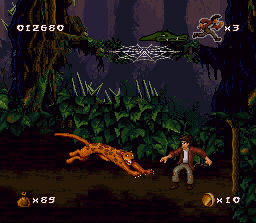 Ce jeu de plate forme est le lointain descendant de Pitfall, le jeu de David Crane créé en 1982 sur Atari 2600. On y incarne d'ailleurs le fils du héros du 1er jeu qui doit traverser la jungle aux mille dangers pour y retrouver son père. De niveaux en niveaux, souvent terminés par un boss, on devra sauter de plate-formes en plate-formes, sur des rochers, s'accrocher à des lianes, se balancer à la Tarzan, et se défendre contre des animaux très hostiles. Pour celà on dispose d'une sorte de petit fouet n'ayant pas beaucoup d'allonge, de projectiles à longue portée en nombre limité, et d'un ou plusieurs boomerangs qu'on peut réutiliser à condition de les rattraper quand ils reviennent. La jouabilité est plutot bonne, mais est loin d'être aussi précise que dans des titres comme Donkey Kong Country. Assez gênant est le sentiment de parfois ne rien pouvoir faire pour éviter d'être touché par un ennemi avant de le toucher à son tour. Heureusement le héros peut être touché plusieurs fois avant de mourir et dispose ainsi d'une barre de vie. D'ailleurs cette dernière est symbolisée par un crocodile qui s'approche inexorablement du héros au fur et à mesure qu'on est blessé. La difficulté est bien dosée (dans les premiers niveaux en tout cas) à condition de s'habituer aux petits problèmes de collision récurrents et au fait que certains ennemis, très petits et souvent placés trop bas ou trop haut, sont très très pénibles à toucher. La réalisation est bonne avec des graphismes détaillés et toujours de bon gout et un héros très bien animé. Les musiques et bruitages se font malheureusement un peu discrets. De par son univers, sa jouabilité et le soin avec lequel l'animation de son héros a été réalisée, Pitfall fait fortement penser à Jungle Book, bien sur, mais aussi à d'autres titres Virgin comme Lion King ou Earthworm Jim (on a exactement le même feeling dans les sauts et les collisions avec les ennemis). Celà peut provoquer une certaine lassitude si on a déjà bien pratiqué ces jeux. Mais ce Pitfall, bien que loin d'être aussi culte que son vénérable ancêtre, est digne de votre intérêt si vous fermez les yeux sur ses petits problèmes de jouabilité. Et puis sachez que vous y trouverez en bonus le Pitfall original (accessible en faisant SELECT,A,A,A,A,A,A,SELECT sur l'écran titre), et ça c'est la classe ! ASSEZ BIEN