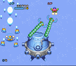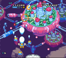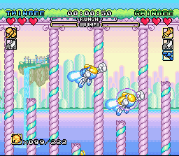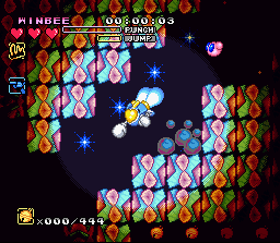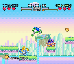 Changement de registre avec cette suite Snes qui est un jeu de plate-forme jouable à 2 simultanément. 3 persos sont disponibles et ont chacun un armement différent et sont plus ou moins portés vers l'attaque ou le vol. Le vol ? Oui, car comme dans Rocket Knight / Sparkster, on peut voler dans ce Twinbee en laissant le bouton de saut appuyé et en se projetant dans une direction, et le level design du jeu exploite bien entendu cette particularité avec des niveaux vastes incitant aux décollages intempestifs ! Les héros peuvent aussi courir, sauter sur la tête des ennemis, adopter une position stationnaire en l'air, et attaquer avec des coups de poing, des projectiles en chargeant son coup (qui permettent de briser certains murs) et des armes trouvées en route. Ces armes sont cachées dans les habituelles cloches colorées qu'on obtient en tuant les ennemis. Les cloches permettent aussi d'obtenir ici encore des boucliers, de la vitesse, et même les fameuses "options" qui suivent le héros. La réalisation est encore une fois très belle avec des graphismes colorés venant mettre en valeur un design toujours aussi craquant, tout comme les sprites des joueurs qui bénéficient de nombreuses et amusantes animations. Le jouabilité ne souffre d'aucun défaut et, malgré les nombreuses actions disponibles, on n'a jamais le moindre problème à controller ses petites robots. Le mode 2 joueurs est assez original. Vu la liberté offerte et les déplacements rapides des héros, il n'était pas évident de garder les 2 joueurs sur le même écran sans recourir à des zooms arrière à la New Super Mario Bros ou sans splitter l'écran. Alors ici, quand un joueur sort de l'écran, la caméra reste sur le joueur 1. Mais le joueur 2 peut demander au jeu de basculer sur lui (bouton SELECT) ou se téléporter à coté du joueur 1 (bouton Y). On peut alors progresser en alternance à des points différents d'un même niveau ou en simultané en restant ensemble dans le même écran. Bien trouvé. Il existe également un autre mode 2 joueurs ou on s'affronte en "versus" et en écran splitté : il faut alors attaquer l'autre joueur avec toute une panoplie d'armes. Ce mode n'est pas franchement passionant par contre. Si le level design de ce Twinbee n'est pas aussi efficace que d'autres titres du genre (comme Sparkster par exemple) et bien que l'action ne soit pas assez variée, Il brille quand même par son identité graphique, son mode 2 joueurs et surtout le fun qu'il dégage par son gameplay rapide et nerveux. A noter que la version Européenne propose un déroulement des niveaux très linéaire alors que la version japonaise permet de choisir ses niveaux sur une carte. BIEN