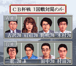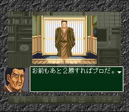 Le fait d'être sorti tardivement n'empêche pas Pro Mahjong Tsuwamono d'être plutot très moche. A l'instar des Pro Mahjong Kiwame (page 94), il propose un habillage sérieux et divers modes de jeu autour de parties de mahjong se déroulant à 4 joueurs. Ici aussi, des quiz en rapport avec le jeu et ses règles sont proposés. A noter qu'il existe une version alternative appelée "Pro Mahjong Tsuwamono : Renka Han" : c'est à première vue exactement le même jeu avec le même écran titre, les mêmes menus, les mêmes musiques, les mêmes adversaires ... etc ... La seule différence que j'ai pu remarquer : le portrait du joueur est remplacé par une silhouette dont on ne distingue pas le visage. Pro Kishi Jinsei Simulation : Shougi no Hanamichi (Atlus - 1996)