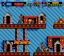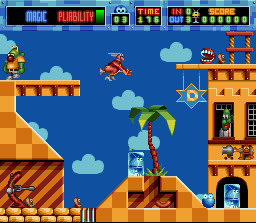 Mais pourquoi ce jeu, suite de Super Putty, n'est-il pas plus connu et plus apprécié ? Bénéficiant d'une superbe réalisation graphique rappelant la patte des demomakers survitaminés de l'Amiga, Putty Squad est un jeu de plate-forme dans lequel on dirige un blob. Dans chaque niveau il doit retrouver un certain nombre de ses congénères avant de gagner la sortie vers le niveau suivant. Les niveaux regorgent d'ennemis et de pièges mais le héros a plus d'un tour dans son sac gélatineux pour survivre à tout ça. Il peut en effet, sauter, s'étendre dans toutes les directions, et donner de vigoureux coups de poing. Ce jeu brille dès le début par un level design original et interessant. En effet, en plus des habituelles plate-formes qui disparaissent ou pics assérés, on a des niveaux très vastes qu'il faudra explorer de fond en comble, sans limite de temps, si on veut récupérer tous les bonus. Et pour celà il faudra exploiter quelques petites subtilités de gameplay. Il y a par exemple les fameux chats qui se baladent à certains endroits. Si on les abat, on peut parfois récolter une boite de nourriture pour chat, à placer n'importe ou dans le niveau. Un nouveau félin apparait alors (il fait parfois une entrée remarquée en skateboard volant !) et on peut de nouveau l'assomer puis se servir de son ventre comme trampoline ! Mais si on n'y parvient pas, il y a toujours une astuce pour explorer les lieux en hauteur : le blob peut se gonfler d'air et s'élever doucement vers les cieux. Mais attention, il perd alors tout doucement de la vie. Un autre bonus permet aussi de se déplacer dans les airs à l'intérieur d'un dirigeable beaucoup plus rapide, mais son utilisation fait également perdre de la vie. Il y a également ces soldats casqués, qu'on peut abattre d'un coup de poing ; mais si on leur saute dessus, ils se retrouvent écrabouillés sous leur casque et ce dernier peut alors servir de projectile, à la manière des carapaces dans Mario, et détruire des ennemis autrement invincibles. Ce ne sont que quelques exemples pour illustrer la richesse du jeu. La réalisation est donc très réussie, sauf peut-être les musiques qui tapent un peu sur le système. Les graphismes sont ultra-colorés, les sprites mignons et très bien animés (il faut voir toutes les mimiques de certains ennemis ou de notre blob, comme ses yeux ou ses toutes petits jambes qu'on apperçois quand il se déplace), et les décors jamais surchargés. La jouabilité est parfaite, la difficulté progressive et le fun est au rendez-vous. Et enfin, cerise sur le gateau, Putty Squad est jouable à 2 simultanément en écran splitté ! Bien sur la visibilité en prend un coup, mais ça reste jouable et l'animation de tous les éléments à l'écran ne ralentit pas. Chapeau ! Pour la petite histoire, le jeu était initialement développé sur Amiga mais n'est jamais sorti sur cette machine (une démo existe). TRES BIEN (d'après les 1ers niveaux en tout cas)