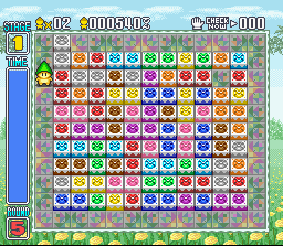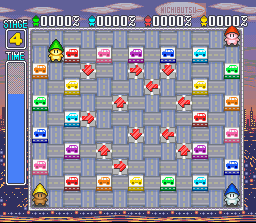 Voici encore un excellent puzzle-game méconnu dans la veine de Keeper vu en page 61. Ici aussi il s'agit de diriger un petit bonhomme qui doit rassembler des blocs identiques par 3 ou plus afin de les faire disparaitre. Mais attention car on ne bénéficie pas de la même souplesse de mouvement que dans Keeper. Ici, à la manière de Pengo, les blocs continuent leur course une fois poussés jusqu'à rencontrer un obstacle, et on ne peut pas les tirer. Ce sont ainsi de nombreux casse-tête de plus en plus compliqués qu'il va falloir résoudre en temps limité (un peu trop limité d'ailleurs). Le principe est d'une efficacité diabolique et fonctionne aussi bien que le classique Sokoban. Mais Puzzle'n Desu! va encore plus loin. Chaque puzzle peut être résolu en s'y mettant à 2, 3 ou 4 joueurs simultanément ! Une idée allèchante mais je demande à voir concrètement si ça fonctionne vraiment, car le temps imparti est encore plus limité que lorsqu'on joue seul, et l'un des joueurs aura vite fait de pousser un bloc sans se concerter avec les autres et ruiner toute une stratégie. En effet, le jeu a un défaut : on ne peut pas annuler un coup. Si on se retrouve bloqué à cause d'une poussette malheureuse, il faut recommencer tout le niveau. Et si vous préférez l'action à la réflexion, un mode "battle" inspiré de Bomberman est présent. Jouable à 4 également, il consiste à éliminer ses adversaires en les écrabouillant avec un bloc qu'on pousse vers eux ! Mais attention car les différents décors sont truffés de blocs spéciaux et obstacles divers. Délirant et extrèmement bien conçu, ce très sympathique bonus n'a qu'un seul défaut : on ne peut y jouer que contre des adversaires humains (pas de CPU). La réalisation est sobre et de bon gout, avec notament des bruitages amusants et des musiques entrainantes. Et si vous devenez accro à ce titre : lancez vous et composez vos propres puzzles grâce à un éditeur de niveaux également présent. BIEN (et peut-etre Tres Bien à plusieurs)