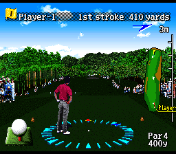Ce second jeu de golf Pebble Beach, uniquement sorti au Japon, profite du même moteur graphique que Harukanaru Augusta 3. C'est donc l'occasion de tester aussi ce dernier, ce que je n'avais pas pu faire en Septembre 2009 pour cause d'incompatiblité des émulateurs. Mais entre temps, Bsnes est passé par là ... Les deux softs disposent de la même jouabilité et de la même interface. Le contenu (options, modes de jeu) est également quasiment identique, seuls les parcours et quelques détails diffèrent (Pebble Beach dispose de plus de tournois). Par rapport à Pebble Beach Golf Links et aux 2 premiers Harukanaru Augusta, le curseur à arrêter au bon moment sur la balle a disparu. Il est remplacé par une modification de la barre de puissance qui gère également l'impact du club sur la balle. Pour le reste, c'est identique aux précédents épisodes et à la plupart des jeux du genre avec un golfeur vu de derrière au moment de la frappe, et les habituels réglages (club, position des jambes, direction). Graphiquement, c'est assez impressionant pour de la Snes avec toujours ce style réaliste et cette représentation en 3D, mais avec des décors plus fins et plus "photo-réalistes". Malheureusement, celà entraine une lenteur certaine lors de l'affichage, ne serait-ce que quand on change très légèrement la direction au moment de la frappe. Le jeu affiche d'ailleurs un message "drawing" pendant que la vue se met à jour: L'autre soucis, c'est encore une fois le fait que ce type de représentation vieillit mal face à la concurrence des jeux de golf modernes, alors qu'un jeu au style 2D classique gardera toujours un certain charme et une esthétique plus intemporelle. Les 2 jeux sont toutefois interessants grâce à leur jouabilité plus exigente que la plupart des autres titres du genre (sur console), donc que les amateurs du genre n'hésitent pas à les essayer. MOYEN