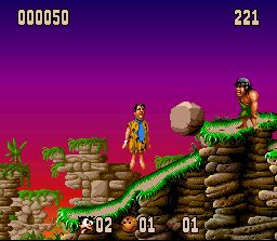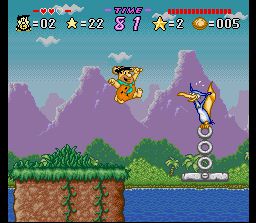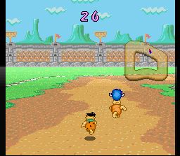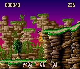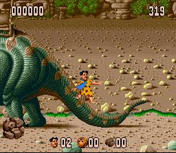 Quelle bonne surprise que ce jeu ! Je n'en avais jamais entendu parler et il se révelle très bon. C'est un jeu de plate-forme aux phases assez variées qui se déroule dans le monde préhistorique du dessin animé "The Flintstones" (Les Pierrafeu). On y incarne Fred et Barney partis en quête d'un trésor. Pour celà il faut arriver au bout de plusieurs plateaux de jeu (type jeu de l'oie) sur lesquels on avance case par case en lançant un dé. Chaque case représente un niveau de plate-forme à traverser en temps limité. Dans ces niveaux on saute avec B (possible de laisser appuyé pour planer un peu) et on donne des coups de massue avec Y : certains sont faciles et plus axés sur la destruction d'ennemis, d'autres plus difficiles et plus orientés "sauts milimétrés sur plate-formes en mouvements", tous sont amusants. Certaines cases nous font plutot affronter des "boss". D'autres donnent lieu à des mini-jeux bonus très variés. En fin de plateau, on doit disputer une course à pied (vue en mode 7 à la Mario Kart) qu'il faut remporter pour passer au plateau suivant. A deux, on joue à tour de rôle en tentant d'accumuler plus de points que l'autre joueur. C'est très jouable, plein de petites subtilités de gameplay (par exemple les pièces de monnaie peuvent servir à acheter des objets dans les magasins ou à effectuer des double-sauts), et vraiment très fun. Seule la réalisation est un peu en retrait avec des décors souvent particulièrement moches et des sprites très inégaux et c'est le seul point qui empêche ce jeu de se hisser au niveau des meilleurs du genre sur Snes. Fortement recommandé en tout cas. 3.5/5