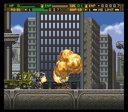 Ce jeu se trouve en marge de la série dont il porte le nom puisqu'il ne s'agit pas d'un tactical RPG mais d'un jeu d'action vu de profil dans lequel on dirige un mecha qui se commande exactement de la même façon que le robot de Assault Suit Valken qu'on a vu en page 06. Normal puisqu'il s'agit de la même équipe à la réalisation. On peut donc sauter, tirer, utiliser une arme secondaire (au début un coup de poing), changer d'arme et se protéger avec un bouclier. D'autres actions sont possibles plus tard en fonction des améliorations apportées à son robot entre chaque mission au magasin. On peut également sortir du mecha pour explorer les environs à pied et accéder à certains passages impossibles d'emprunter autrement. Les différentes parties du robot peuvent être customisées en achetant du matériel et des armes tandis que le pilote gagne des points d'expérience. On a rapidement accès à tout un arsenal qui permet de personaliser son mecha comme on le souhaite afin de varier ses stratégies. Attention : plus on utilise une arme plus cette dernière gagne en efficacité. L'histoire s'inscrit assez bien dans la saga Front Mission, mais avec un traitement un peu moins réaliste et plus dramatique avec des personnages plus hauts en couleur. On se retrouve encore au milieu d'un conflit militaire et le héros (Albert) doit au début du jeu aider à fuir le président d'une nation sur le point d'être renversée par un coup d'état. On retrouve donc la jouabilité de Valken (un poil plus souple tout de même) et aussi sa mise en scène avec des dialogues au milieu des niveaux qui soulignent efficacement l'action. Mais Gun Hazard est plus un compromis entre de l'action et des éléments de RPG (customisation surtout) avec une histoire travaillée et interessante et plus de profondeur au niveau de ses personnages ; alors que Valken est un pur jeu d'action/plate-forme, plus difficile et bénéficiant d'une action plus soutenue et moins répétitive (pas de niveaux quasi-identiques à faire plusieurs fois pour accumuler de l'expérience et de l'argent par exemple). Valken bénéficie également d'un bien meilleur level-design.Gun Hazard est un bon jeu en tout cas, avec une histoire interessante et pleine de rebondissements, une bonne réalisation et des musiques assez géniales. 3.5/5