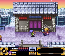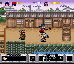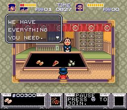 La série des Ganbare Goemon de Konami a été déclinée sur de très nombreuses plate-formes mais malheureusement peu de jeux sont parvenus jusqu'à l'occident. Fort heureusement, le 1er épisode sur Snes est de ceux là. La traduction a changé les noms des héros (Goemon et Ebisumaru deviennent Kid Ying et Dr Yang) mais a également un peu altéré le contenu avec un niveau de difficulté revu à la baisse (ça reste balaize quand même) et quelques mini modifications / censures assez regrettables mais pas catastrophiques. Jouable à 2 simultanément, le jeu nous permet de controller des héros rigolos combattant des fantômes et devant sauver une princesse dans un monde médiéval-fantastique japonais fortement imprégné du folklore de l'archipel. Les monstres qu'on y croise renvoient à de célèbres légendes mais le tout est traité avec un humour décapant. On alterne 2 phases de jeu : dans la première, on parcoure une ville ou un village en vue de dessus et il faut se débarasser d'ennemis arrivant de tous les cotés tout en entrant dans des maisons pour récolter des informations, acheter des objets ou jouer à de nombreux mini-jeux. La seconde phase est un action/plate-former vu de coté ou il faut progresser en frappant et sautant jusqu'au boss. Les héros peuvent, sauter, frapper avec leur arme principale ou lancer des pièces de monnaie sur les ennemis (mais l'argent est précieux, attention !) ou utiliser des objets (des bombes par exemple). A 2, on peut aussi s'entraider avec un jouer à califourchon sur l'autre, ce qui ne manquera pas de déclencher quelques fou-rires. Ce principe va se retrouver dans les 3 autres épisodes présentés plus bas, avec quelques changements mineurs. Le jeu est parfaitement jouable, même s'il requiert un tout petit temps d'adaptation pour les phases vues de dessus. La réalisation est très bonne, surtout pour un jeu de 1991, les musiques sont particulièrement entrainantes avec des mélodies accrocheuses et des sonorités qui font penser à des instruments traditionnels, et les graphismes colorés font parfaitement ressortir l'humour du jeu. Ce dernier est omniprésent : dans l'animation des ennemis ou des héros (il faut les voir ramper !), dans l'absurdité des situations, dans les cut-scenes ... etc ... Un petit mot sur les mini jeux : on trouve de tout, avec des jeux d'adresse comme de hasard. Citons en vrac un whack a mole, un pong, un casse-briques, un jeu de dés, un shmup (Gradius !) ... etc ... A noter qu'ils sont facultatifs donc rien ne vous empêche de vous concentrer sur la quête principale si vous le souhaitez, mais ce serait bien dommage ! Bien réalisé, jouable et très amusant, c'est une valeur sure de la Snes. Tout n'est pas parfait non plus : ainsi la difficulté est assez élevée à cause d'un système qui fait que le héros perd ses upgrades durement gagnées ou achetées quand il se fait toucher, ce qui peut amener à des situations infranchissables. De nos jours, les save-states permettent en partie de contourner ce problème, mais ce n'est pas l'idéal. En bref : du très bon Konami et un jeu que j'apprécie particulièrement. 4.5/5 On en apprend beaucoup plus sur ce jeu en lisant le très bon article de David ici : http://www.grospixels.com/site/ggoemon.php Ganbare Goemon 2 : Kiteretsu Shougun Magginesu (Konami - 1993)