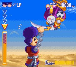 Les 2 héros du premier jeu sont de retour et sont cette fois accompagnés d'un 3ème larron nommé Sasuke, un petit ninja-robot, pour repousser l'invasion de vilains occidentaux déguisés en lapins (crétins ?) souhaitant balayer la culture ancestrale japonaise pour imposer leur propre culture lapinesque (?). D'entré on constate que cette suite met plus l'accent sur les phases de plate-forme vues de profil. Les phases vues de dessus dans les villages sont plus courtes et on y rencontre beaucoup moins d'ennemis (parfois pas du tout : on ne fait que discuter et jouer à des mini-jeux toujours aussi bons). La réalisation est bien meilleure avec une revue du design (rassurez vous, c'est toujours dans le même ton), et des sprites plus gros et colorés. Le gameplay n'a pas changé à part pour l'introduction de véhicules / montures à utiliser dans les niveaux et, surtout, l'entrée en scène de Impact, le robot géant à piloter lors de certaines scènes qui se terminent toujours par un affrontement contre un boss en vue subjective depuis le cockpit du robot. Le jeu fait toujours preuve d'un humour et d'une fantaisie de tous les instants qui font qu'on le parcoure de bout en bout le sourire aux lèvres. Le bout justement, on a de grandes chances d'y arriver plus rapidement que dans le 1er jeu car le niveau de difficulté a été clairement revu à la baisse. Il y en aura peut-être pour critiquer cet épisode en disant qu'il n'apporte pas énormément au précédent (certains préfèrent le 1er) et que sans son habillage et son univers, il présente des niveaux de plate-forme classiques avec un level-design moins original que d'autres hits de l'éditeur (Tiny Toons). C'est pas tout à fait faux. Mais tant qu'on rigole et qu'on s'amuse, avec un gameplay bien huilé, moi je réponds présent. 4/5 Ganbare Goemon 3 : Shishi Juurokubei no Karakuri Manjigatame (Konami - 1994)