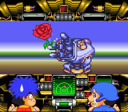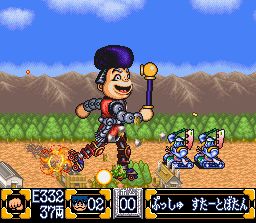 La recette de ce 4ème épisode reste la même mais Konami a modifié quelques ingrédients et changé les quantités. Ainsi les phases de plate-forme sont de nouveaux linéaires et en temps limité. Quand aux phases dans les villes, elles donnent lieu à de véritables petites histoires avec des mini-quêtes, ce qui rend malheureusement le joueur occidental encore plus dépendant de l'utilisation d'un faq pour les passer. Nos héros sont 4 dès le départ et ils sont embarqués dans l'espace par le robot Impact qui leur demande de l'aider à combattre un tyrant intergalactique obsédé par les sports sur plusieurs planètes. Au début du jeu, les 4 héros sont séparés et vivent chacuns leur petite aventure. Entre chaque niveau il est possible de passer de l'un à l'autre à volonté ce qui donne dès le départ accès à de nombreux niveaux différents. Plus tard, tous les persos se réuniront et on pourra alors changer de héros à volonté au sein du même niveau (pour bénéficier de leurs capacités un peu différentes) comme dans Goemon 3. Chaque monde se termine par un boss et les affrontements contre ces derniers servent de prétexte à des mini jeux très variés (quizz, puzzle-game, mini jeu de réflexes ...). Evidemment, comptez sur les développeurs de Konami et sur leurs réserves inépuisables de sake pendant les périodes de brainstorming pour vous pondre des tas de trouvailles visuelles et ludiques toujours complètement débiles ! Goemon 4 est techniquement impressionant avec de superbes décors vraiment très détaillés et colorés, et des musiques excellentes. Mais (car il y a un "mais"), le fait de devoir obligatoirement se farcir les phases d'aventure avec un faq (aucune traduction n'est dispo à ce jour) s'ajoute au fait que les phases de plate-forme soient extrèmement difficiles (et ce dès le début) et celà nous donne une expérience de jeu moins agréable que les autres. Mais si vous êtes "hardcore" et si vous lisez le japonais courrement, alors FONCEZ car on tient là certainement excellent épisode de la saga et le plus réussit techniquement (sur Snes). 3.5/5 PS : merci Neo_Tsubasa et bienvenue sur Grospixels.
