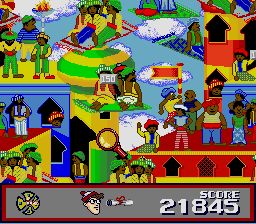 Ou est Charlie ? Qui a répondu DTC ?!? En même temps ça expliquerait l'odeur nauséabonde dégagée par ce jeu. Il s'agit donc dans cette adaptation des "aventures" du célèbre personnage de retrouver Waldo (Charlie en français) qui est caché dans un décors volontairement sur-chargé et coloré. On dirige pour celà une loupe et il faut cliquer sur Waldo avant la fin du temps imparti. On peut trouver d'autres bonus comme du temps supplémentaire ou bien le chien de Waldo. En cliquant sur ce dernier, on arrive à un niveau bonus horriblement soporifique dans lequel on dirige le clébard sur un tapis volant pour ramasser des nonoss. Le problème du jeu (au delà du concept original déjà pas passionant à la base) est que la résolution de la Snes ne permet pas d'afficher des décors trop complexes et Waldo est donc toujours très facile à trouver. Le reste du produit est baclé avec des musiques immondes et très peu de contenu (seulement 5 tableaux apparement). Qui trouvera Waldo ? Pas moi ... 0/5