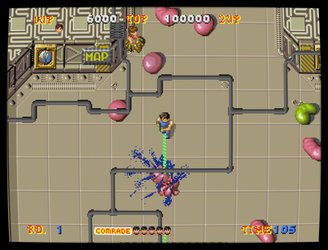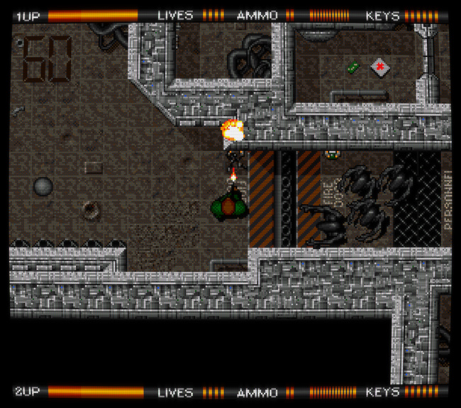 Alien Breed de Team17 est une série née sur Amiga en 1991 ; on pourrait décrire brièvement son premier volet, analysé en détail plus bas, comme un jeu de tir futuriste et horrifique vu du dessus. C'est un incontournable de l'ordinateur 16 bits, faisant partie de la douzaine de jeux Amiga auxquels j'ai encore du plaisir à jouer aujourd'hui (je ne dirais pas la même chose du reste de la série sur la machine, composée de quatre jeux en 2D suivis de deux jeux copiant le rendu 3D de Doom). Presque vingt ans plus tard, Team17 (plutôt connu pour la série des Worms) a annoncé un reboot de la série, une trilogie publiée épisode par épisode sur les principaux services de jeu dématérialisé, puis une édition physique complète sur ces mêmes supports (Xbox 360, PS3, PC) une fois la trilogie terminée. ![]() Naturellement, avoir "ses racines en 1990" était alors proféré comme une insulte, censé expliquer un gameplay très pauvre – cette critique, qui affirmait également que la série Alien Breed copiait Alien Syndrome (arcade, SEGA), est typique de ce travers de la presse vidéoludique consistant à parler avec aplomb de ce que l'on ne connaît pas : voilà une occasion idéale de rétablir quelques faits concernant Alien Syndrome, le premier Alien Breed sur Amiga, et cette nouvelle trilogie de Team17 qui comporte en réalité quatre jeux puisque son premier volet a connu deux versions distinctes... Un petit détour du côté de chez SEGA (Alien Syndrome)Précédant Alien Breed de quatre années, Alien Syndrome est un jeu d'arcade de 1987 qui lui ressemble à priori comme deux gouttes d'eau : tous deux sont des jeux de tir en 2D vus du dessus et sont jouables seul ou à deux en coopération ; tous deux sont fortement inspirés par ALIEN et surtout Aliens (sorti en 1986) puisqu'ils nous font affronter des hordes extraterrestres bestiales dans des labyrinthes métalliques (ou organiques) sous la menace de l'autodestruction imminente d'une station spatiale ; tous deux partagent un panel d'armes similaire (arme de base, boules d'énergie, lance-flamme, laser) et comportent des bornes où l'on peut consulter la carte du niveau en cours ; tous deux ont des boss énormes, voulus spectaculaires... En fait, leurs similitudes sont si évidentes que Alien Syndrome est souvent cité pour décrire brièvement Alien Breed, et pourtant, ce sont de parfaits faux amis, complètement différents sur leur fond comme leur forme et donc passionnants à comparer. Sur le fond, malgré les apparences, on pourrait argumenter que Alien Syndrome est une variante de Pac-Man (!) : on y évolue dans un labyrinthe ouvert au tracé très simple afin d'y collecter des objets (ici, des "camarades" prisonniers de cocons à la Aliens) qui permettront de débloquer l'accès au niveau suivant. Dans ce labyrinthe, des ennemis errent plus ou moins au hasard alors que d'autres nous pourchassent, mais on peut se défendre en ramassant des powerups placés à des endroits précis. ![]() Bien entendu, malgré ces grandes lignes, il y a des différences importantes... Principalement, l'action de Alien Syndrome est très zoomée par rapport à Pac-Man : les couloirs du labyrinthe sont plutôt larges et certaines zones y sont vastes et dégagées, avec des hordes grouillantes qui ont tendance à nous encercler. On peut se déplacer dans huit directions, et se défendre par défaut en tirant des balles à courte portée ; les armes collectées, plus puissantes, remplacent l'arme actuelle jusqu'au niveau suivant, et l'on peut de surcroît équiper jusqu'à deux "options", des robots qui tirent dans notre dos et protègent ainsi nos arrières. Il n'y a pas de munitions. Les monstres et notre héros meurent en un coup, mais les générateurs de monstres sont plus résistants et risquent de nous faire perdre beaucoup de temps. Lorsqu'on meurt, on réapparaît aussitôt en bénéficiant d'une brève invincibilité, sauf si notre mort résulte de l'explosion de la station, auquel cas on devra recommencer le niveau. Alien Syndrome est un jeu d'arcade typique de l'époque : une action très simple, prenante et immédiatement compréhensible, un joystick et un unique bouton, mais un défi relevé, sa principale difficulté provenant de ses contrôles classiques – comme on doit se tourner vers un ennemi pour lui tirer dessus mais que l'on est environné d'ennemis mortels aux trajets peu prédictibles (sans parler des projectiles), on doit constamment arbitrer entre l'attaque et l'esquive, un peu à la manière d'un Commando multidirectionnel (arcade, Capcom, 1985). Les boss, quant à eux, peuvent nous tuer à répétition tant que l'on n'a pas bien saisi leur logique, mais ils deviennent assez faciles lorsqu'on les connaît, surtout équipé de la bonne arme (dans le doute, choisir le laser). ![]() Avec assez de crédits, la difficulté est bien plus clémente lorsqu'on joue à deux (on peut incarner un homme ou une femme, Ricky ou Mary) puisqu'on peut alors continuer après un Game Over, chose impossible en solo. Dans les deux cas, le jeu et son scoring s'avèrent toujours amusants et stimulants aujourd'hui, avec une dimension de risque/récompense intéressante. Sur la forme, malgré l'influence évidente de Aliens (le design des monstres du second niveau frôle le plagiat), l'esthétique est ici plutôt "pulp", claire et colorée, avec des extraterrestres excentriques à la fois perturbants et comiques, rappelant la borne d'arcade tirée de Aliens (Konami, 1990), ça a un charme fou ! Techniquement, le jeu est très propre et fluide, avec trois plans de scrolling différentiel superposés et de jolis effets de transparence. Il n'y a que deux musiques accompagnant le jeu, une pour les phases de sauvetage et une pour les boss, mais elles sont très réussies, instaurant une ambiance pesante. Player one requires keys (Alien Breed sur Amiga)Si Alien Syndrome était en quelque sorte Pac-Man croisé avec Commando pour un résultat