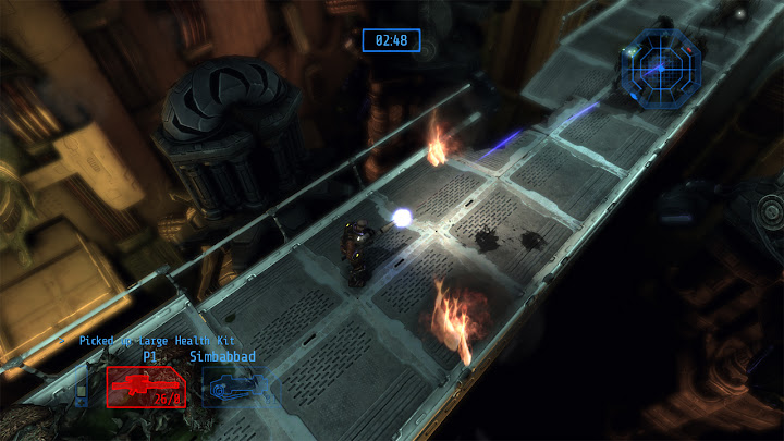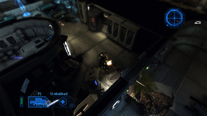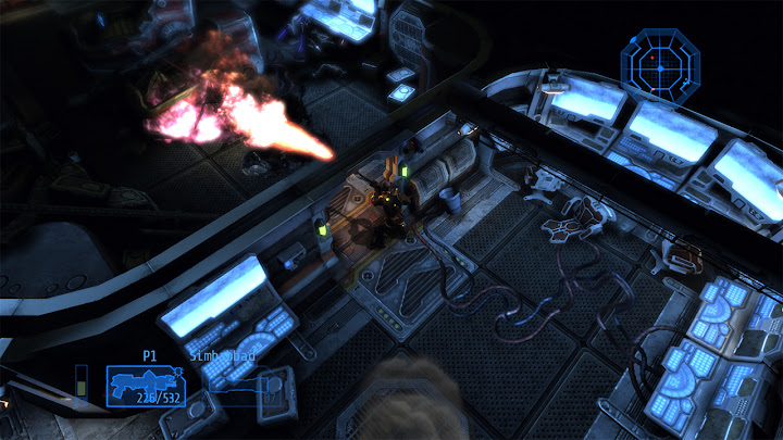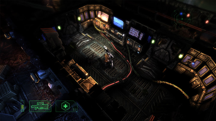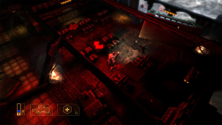 Cela crée une situation intéressante, puisque l'on peut mesurer ici précisément l'impact de ces ajouts : ils ne corrigent pas tous les problèmes de Alien Breed Evolution, mais ils transforment un jeu médiocre en bon jeu pourvu qu'on l'aborde correctement. Le retour des magasins Intex est particulièrement important puisqu'ils rendent un degré de liberté décisif au joueur : ils permettent ainsi d'opter pour différentes stratégies en privilégiant certains outils, armes ou capacités, et la gestion des ressources est encore approfondie par le fait que chaque magasin présente ses propres limitations de stocks – il peut donc être prudent d'acheter certains objets à l'avance, car on ne sait pas quelles quantités seront disponibles ailleurs. Les armes elles-mêmes ne sont pas négociables, mais on peut améliorer celles que l'on a ramassées en vitesse de rechargement, débit, ou dégâts infligés. Dans ce dernier cas, la nouvelle puissance de feu est très visible (et audible), ce qui est extrêmement satisfaisant, surtout pour le lance-flamme, très utile face aux groupes. On peut aussi accroître la puissance des grenades, la vitesse d'utilisation et l'efficacité des kits de soins, ou bien l'intensité de nos coups de crosse. Les arbitrages sont cruciaux et rendent le jeu plus varié et plus intéressant. ![]() La meilleure différenciation des races ennemies est aussi appréciable, on sait désormais d'un seul coup d'œil s'il faut se préparer à esquiver des projectiles ou une charge, même si le jeu reste davantage un survival horror qu'un jeu d'action. Enfin, la possibilité de désactiver les points de navigation semble en théorie idéale pour casser l'aspect "reliez les pointillés" du jeu, renouant avec des éléments d'exploration typiques du survival horror que l'on trouvait déjà dans le premier Alien Breed ou, plus classiquement, dans Resident Evil ou Silent Hill par exemple ; mais ici cela ralentit trop le rythme et produit plus d'agacement que d'immersion ou d'anxiété : comme je l'ai déjà expliqué, malgré la qualité des graphismes et le soin apporté aux décors, le jeu propose un level design trop dense et imbriqué (voire fouillis) pour que l'on s'y repère intuitivement, il vaut donc mieux privilégier en l'occurrence la facette "arcade" du jeu et garder le guidage automatique. On le verra, ça sera l'inverse dans le prochain épisode... Finalement, malgré une mauvaise réputation héritée du faux pas qu'aura été Alien Breed Evolution, Alien Breed Impact est un jeu réellement bon : si l'on ne s'attend pas à jouer à un jeu "action/tactique" comme Alien Shooter 2 : Reloaded ou à un jeu d'action multijoueur nerveux comme le Alien Swarm de Valve, et qu'on accepte au lieu de ça la nature "survival horror light" du jeu signé Team17, on passe quelques heures très agréables (une heure par chapitre environ, pour cinq chapitres), surtout si l'on démarre sa partie au mode de difficulté "Élite" (le plus dur), qui met bien en avant les mécaniques de survie et l'atmosphère du jeu – respectez soigneusement les recommendations des réglages de luminosité et jouez avec un casque audio pour maximiser la tension ! Il faut noter que, comme ses prédécesseurs, Alien Breed Impact offre également du jeu à deux joueurs, mais celui-ci concerne un mode séparé de l'aventure solo, couvrant trois niveaux dédiés. Retour en force (Alien Breed Assault)Autant le dire tout de suite : Alien Breed Assault est mon préféré de la trilogie. ![]() Si Alien Breed Evolution avait pâti de ses ambigüités et contradictions, Alien Breed Assault assume quant à lui bien mieux sa nature de survival horror, et le jeu en bénéficie grandement. Un des principaux facteurs de cette réussite, c'est le cadre : Conrad n'évolue plus ici dans le Leopold mais dans le UCS Aguirre, le vaisseau fantôme d'où viennent tous les monstres et les soucis. Au lieu d'une architecture neuve et futuriste ayant très lourdement souffert d'une catastrophe, nous avons donc affaire ici à une architecture ancienne voire rétro (vieille de plus de trois siècles) qui a subi l'usure du temps, mais qui a surtout été brutalement envahie (on peut apercevoir des traces de barricades et de combats) par l'armada de monstres déjà rencontrée, qui s'y est installée et en a fait son nid. Naturellement, tout s'y trouve donc dans un état de délabrement avancé, comme gangréné par l'activité des bestioles, constituant une "scène de crime" idéale pour le survival horror. Sur le plan artistique, ce contexte sinistre est renforcé par un splendide design de "science-fiction médiévale" à la Event Horizon, suivant un agencement bien distinct de celui du jeu précédent... Dans une telle situation, Alien Breed Assault est le seul volet de la trilogie pour lequel je recommande de désactiver les points de navigation : le level design étant ici bien plus lisible qu'auparavant, avec une structure générale cohérente dans laquelle on prend plaisir à se repérer, et des salles marquantes et intrigantes qui invitent à l'observation (pour apprécier leur ambiance ou deviner ce qui s'y est passé), on ressent cette fois une réelle satisfaction ludique et immersive en s'orientant "à l'ancienne". ![]() Autre vecteur d'immersion : les éléments de mise en scène qui avaient cruellement manqué à Alien Breed Impact accompagnent désormais chaque objectif de Conrad, avec des mouvements de caméra ou des scénettes clarifiant les galères que notre héros va traverser dans ses tentatives pour sauver le Leopold. Même s'il n'y a toujours pas de dialogues parlés, cette dramatisation donne suffisamment de sens à l'action, et nous laisse le temps de lire les textes d'exposition, par ailleurs mieux écrits. Pour pimenter cela, diverses petites touches de gameplay ont été ajoutées, comme des moments où l'on doit zigzaguer entre les flammes, ou avancer prudemment entre deux jets de gaz toxique, o
