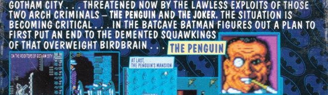 ![]() Réalisé près d'un an avant la sortie du film de Tim Burton, Batman – The Caped Crusader (BCC) n'est en rien un produit dérivé de la « batmania » et c'est tant mieux car c'est un vrai jeu, parfaitement pensé dans tous ses aspects, et non l'exploitation mercantile d'une licence, chose à laquelle l'éditeur Ocean s'est pourtant de nombreuses fois livré. ![]() ![]() Les jeux au concept les rendant susceptibles d'être aussi bien jouables sur 8-bits que sur 16-bits ont toujours possédé un charme particulier. Combinant le soin apporté à la réalisation avec une certaine économie de mouvement à l'écran, ils ne proposent pas une action frénétique, trouvant leur intérêt dans un gameplay posé et réfléchi à base d'énigmes à résoudre, n'utilisant pas la surenchère visuelle pour maintenir en éveil le joueur. C'est sur cet équilibre fragile que repose la réussite de BCC. ![]() ![]() Nantie d'un énorme succès, la série déboucha en 1966 sur deux longs métrages exploités en salles (seulement aux US), qui furent froidement accueillis, ce qui empêcha Adam West de décoller en tant qu'acteur. Le Batman de la série n'a pas grand chose à voir avec celui qu'ont plus tard incarné Michael Keaton, Val Kilmer, Georges Clooney et Christian Bale. Loin de l'être torturé et avide de vengeance qu'on connaît, il est plutôt prétentieux et ridicule, assez maladroit, et à son costume moulant un peu rococo s'ajoutent tout un tas d'accessoires très rigolos aux noms démentiels mais qu'on ne verra que rarement en action, faute d'effets spéciaux dignes de ce nom. Les épisodes, filmés en studio, sont constitués à 90% de dialogues ineptes récités avec le plus grand sérieux, entrecoupés de bagarres lors desquelles des bruitages de BD apparaissent à l'écran. Mais ne vous y trompez pas : c'est un régal ! ![]() ![]() C'est ce Batman qu'on retrouve dans le jeu d'Ocean et le joueur va devoir l'accompagner dans deux aventures : A bird in the Hand contre le Pingouin, et A fête worse than Death contre le Joker. La première chose qui frappe lorsqu'on découvre les versions ST et Amiga, c'est la qualité graphique du jeu et la petite taille de la zone d'écran qu'il occupe. Pour ce dernier point, les choses s'expliquent rapidement : en fait, le jeu est affiché à la manière d'une bande dessinée dont les cases s'empilent les unes sur les autres. À chaque fois que l'on change de lieu, le suivant apparaît dans une nouvelle case qui vient se superposer aux précédentes, qui, pour créer un effet de relief, ne sont plus que partiellement visibles et passent en « grisé ». L'effet est magnifique et c'est une vraie trouvaille, qu'on n'a vue dans aucun autre jeu (en dehors de Comix Zone, qui ne reprend pas l'idée d'empilement mais situe aussi son action au sein d'une BD). ![]() ![]() Les combats, contre des hommes de main du Pingouin ou du Joker, ne sont là que pour compliquer un peu la tâche du joueur, BCC étant bel et bien un jeu d'aventure, dans lequel la gestion de l'énergie du héros devient vite une obsession. On touche là le point discutable du jeu : à tout moment, le fait de presser le bouton de tir tout en tirant le joystick fait apparaître un inventaire. Les nombreux objets que Batman est amené à ramasser apparaissent et il est possible de les utiliser ou de s'en débarrasser. Au centre, la tête de Batman est dessinée, symbolisant l'énergie du héros. Celle-ci se change peu à peu en squelette à mesure que son énergie diminue. Non seulement le processus ne s'arrête pas lors des accès à l'inventaire, mais en plus il est d'une effrayante rapidité ! Chaque utilisation d'un objet est l'occasion de constater qu'on a perdu beaucoup d'énergie, et le joueur se retrouve mis sous pression alors qu'il aimerait bien savourer tranquillement le jeu. ![]() La première aventure confronte Batman au Pingouin. C'est celle-ci qui inspire la magnifique page de présentation du jeu, particulièrement réussie sur ST, dont les couleurs plus vives que celles de l'Amiga étaient pour l'occasion tout à fait appropriées. Batman doit contrecarrer les plans de domination mondiale du Pingouin. Pour ce faire, il va devoir pénétrer le repaire de son ennemi (une usine), et introduire une disquette plombée d'un virus dans son ordinateur. ![]() Les deux aventures démarrent dans la Batcave, QG secret de Batman, puis se déplacent dans divers endroits de Gotham City avant de se terminer en terrain ennemi, chez le méchant. Batman se déplace tout le long à pied. Pas de Bat-wing au programme, donc, pas de course en Batmobile, ni de vol d'immeubles en immeubles accroché à des Bat-grappins (ce qui est logique dans une adaptation du Batman télévisuel). Toute la difficulté réside dans le temps réduit dont on dispose et la combinaison de différents objets, dont certains sont parfois sibyllins, comme par exemple un nez rouge de clown (qui sert en fait à se rendre invisible des ennemis !). ![]() ![]() Si les graphismes sont en tous points superbes, dignes d'une très bonne BD, la bande son laisse perplexe. Reprenant à l'envi le thème rigolo de la série télé, elle prend très rapidement la tête mais on se demande un peu si ce n'est pas un fait exprès, tant on est vite tenté de réduire le volume sonore quasiment à zéro. Il n'y a aucun effet sonore qui ponctue l'action, et la musique a le même rendu quelle que soit la version du jeu. ![]() Les auteurs de BCC, Jonathan Smith, Charles Davies et Keith Tinman (formant à l'origine le studio Special FX), ont par la suite continué d'œuvrer pour Ocean, réalisant quelques jeux issus de licences de films et en reprenant différentes scènes pour en faire des minis-jeux d'action, comme par exemple The Untouchables (Les Incorruptibles, d'après le film de Brian de Palma), avec à chaque fois une certaine réussite, surtout si l'on considère la qualité médiocre de ce genre de jeu. Jamais ils ne retrouveront toutefo