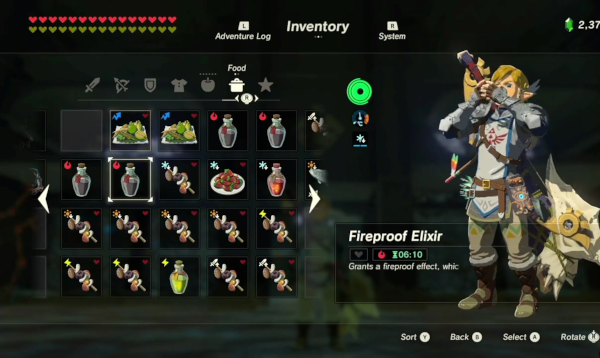 Le jeu n'a du reste pas été avare en nombre de recettes différentes : des chutneys de fruits, des currys, de la viande ou du poisson préparé de multiples façons, des brochettes de champignons..., il y a plus d'une centaine de façons distinctes de cuisiner dans BotW. Même si le changement est surtout cosmétique, et même si l'on apprend rapidement à préparer les plats les plus utiles (typiquement, ceux qui vous redonnent toute votre vie et des cœurs supplémentaires, ou qui augmentent beaucoup votre attaque pendant plusieurs dizaines de minutes), on se surprend à profiter dès que possible des arrêts-buffets. Chaque relais aux chevaux et chaque village proposent des marmites, sans parler de celles que l'on trouve dans la nature, et on peut les utiliser librement à la condition qu'un feu y est allumé, ce à quoi on peut remédier très facilement. Ce choix de jeu reconditionne assez notre exploration dans la mesure où l'on ne peut plus, comme jadis, se lancer tête baissée vers notre destination sans y réfléchir. Il faut à présent se préparer, concocter des petits plats ou des potions nous permettant de résister au froid mordant ou à la chaleur désertique, sans avoir l'assurance que cela sera effectivement suffisant. Couplé avec l'absence d'objectifs précis ou de cartes détaillées, ce système fait de nous de véritables aventuriers, partant à la conquête d'une terre sauvage sans que l'on ne puisse savoir par avance où nous pourrons camper.