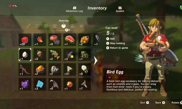 Une autre nouveauté frappante de BotW au regard de ses prédécesseurs est la façon dont il gère les ressources historiques de la série, soit les cœurs de vie, l'argent, les épées, les arcs et les boucliers, en s'inspirant davantage de ce qui se faisait dans les jeux de rôles à la Skyrim ou à la Dark Souls, quelque part. Pour qui était habitué aux systèmes précédents, cela participe énormément à la difficulté initiale du jeu et, pour certaines de ces décisions tout du moins, ces choix cristallisent la critique la plus forte qu'on lui a faite. Dès le début de l'aventure, on remarquera rapidement que les fourrés ou les ennemis ne laissent point, comme à l'ordinaire, des cœurs de vie ou de l'argent. Si on peut éventuellement trouver des rubis sous certains pots ou dans des caisses, le pécule sera des plus limités. En revanche, on trouvera en abondance dans la nature des fruits, des champignons et des herbes, et les ennemis laissent à leur mort, outre leur équipement, des matériaux divers, des canines, des ailes, des yeux voire, qui rejoindront notre inventaire.