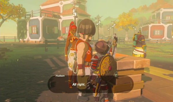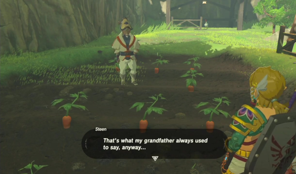 Une fois encore, le soin du détail et l'intérêt porté à ces petits moments insignifiants participent grandement au charme de l'aventure, et on continue encore à trouver des petites choses séduisantes que les développeurs ont pensé à inclure. Certains personnages sont restés dans les mémoires, comme on les apprécie et qu'ils sont délurés : Pru'Ha est une scientifique centenaire qu'une expérience malheureuse a fait rajeunir à ses six ans ; Riju est la chef des Gerudos, et compense sa petite stature par une férocité inégalable au combat. Même les seconds couteaux, et ils sont nombreux comme il y a plus d'une centaine de personnages nommés individuellement dans l'aventure, ont leur petit trait de personnalité, leur caractère et leur histoire, même si petitement développé, entre le passionné des sources chaudes, le curieux de la paravoile ou la commerçante qui cherche à agrandir sa boutique. Trois personnages, cependant, ont tiré leur épingle du jeu et sont devenus des favoris. Le premier est Grosaillieh, un artisan qui bosse sans traînailler et qui sera au cœur de l'une des quêtes les plus longues du jeu. Il souhaite effectivement construire son propre village, Euzero, et nous demande tant de l'aider à construire des baraques qu'à faire venir des habitants et habitantes intéressées à changer de vie. Il y a une contrainte particulière cependant : il faut que leur nom se finisse par « -ieh » pour correspondre au motto de son entreprise. Alors, à vous de souvenir où se trouvent Shantieh, Kornueih, Pervieh et Klavieh, en espérant que vous ayez prêté attention jadis à leur nom.