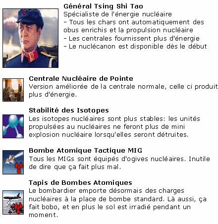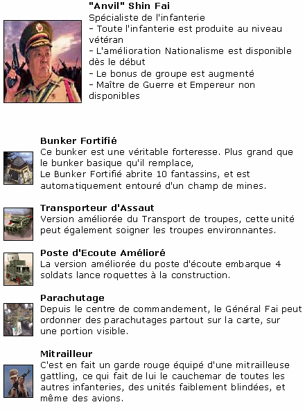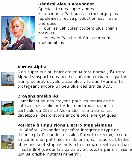 Poste Mobile d'Ecoute : Issu des recherches en communications, le Poste Mobile d'Ecoute peut se déployer n'importe où sur la carte, et renseigner les généraux sur les mouvements d'unités ennemies, même furtives, se trouvant dans son rayon d'action. Au besoin, il peut être protégé en embarquant des troupes lance roquettes.