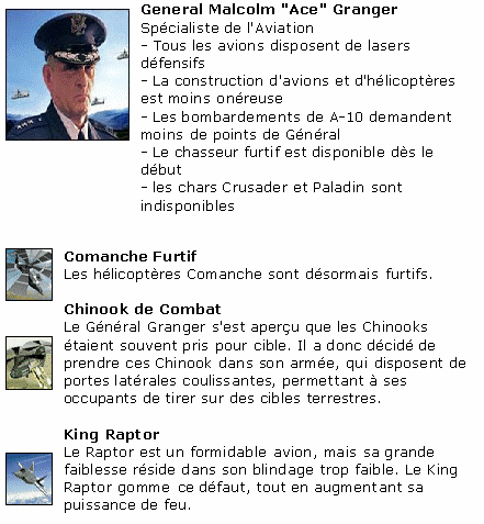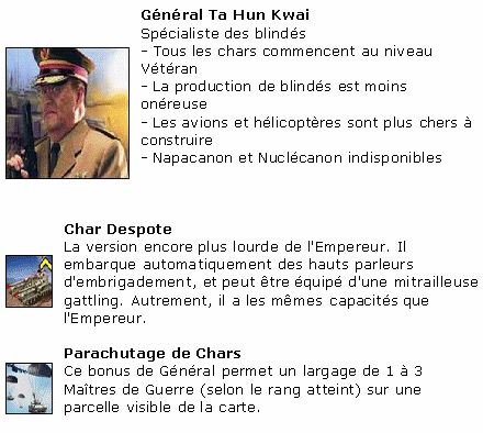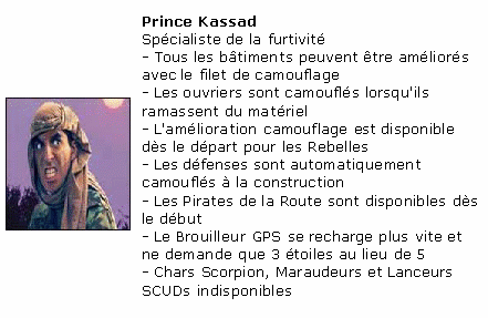 Vous le voyez, les ajouts sont au pire très peu utiles (poste mobile d'écoute, drone sentinelle), au mieux très sympathiques (attaque furtive ou position de tir). Les camps de base restent donc plutôt inchangés, il suffira de prendre en compte ces nouvelles données. De nouveaux upgrades sont aussi de la partie, mais ils sont trop nombreux pour être cités ici. Sachez juste que les ouvriers de la GLA, à force de se plaindre de leur manque de chaussures, pourront être chaussés par le biais d'un upgrade, de cette manière ils marcheront plus vite. Personnellement, j'ai trouvé ça plutôt comique, preuve qu'il y a tout de même une petite pointe de folie dans cette extension. Mais c'est bien la seule... ![]() ![]() L'attrait principal de Zero Hour est bien entendu la possibilité d'incarner 9 généraux qui ont leur spécificité propre, et de confronter sa technique aux autres généraux (humains de préférence). Chacun possède des unités qui lui sont propres, et d'autres qu'il ne pourra pas construire. Voyons dans le détail chacun de ces 9 généraux : Généraux USA![]() ![]() ![]() Généraux Chine![]() ![]() ![]() Généraux GLA![]() ![]() ![]() Comme vous pouvez le constater, chaque général possède une particularité obligeant à jouer différemment le même camp, ce qui est excellent d'un point de vue stratégique : un général Shin Fai jouera totalement différemment d'un Ta Hun Kwai, par exemple. Certaines combinaisons sont plutôt heureuses, car jouer la Chine en n'ayant que des soldats force à recourir à des trésors d'ingéniosité, mais je vous rassure, chaque général a été correctement étudié, et il vous sera toujours possible de venir à bout d'un général ennemi : un combat entre le Prince Kassad et Ta Hun Kwai (général blindé chinois, je vous rappelle) semblerait perdu d'avance pour le Prince ? Pas si sûr... Pour ma part, mes favoris sont Shin Fai, Townes et Rodall Juhziz. Avec eux, j'ai mes petites techniques éprouvées lors de mes nombreuses parties sur Internet. Avec cet add-on, EA a décuplé le plaisir ressenti en multijoueurs. Generals devient le RTS le plus abouti du point de vue stratégique et améliore sensiblement le gameplay original, mais j'aurais aimé qu'ils fassent une vraie campagne solo plutôt que de reproduire l'erreur commise avec le jeu de base. Cette nouvelle série de l'univers Command & Conquer est plutôt sympathique, car Zero Hour est clairement l'add-on qui manquait, mais Generals reste quand même en-dessous des séries originales du point de vue plaisir de jeu. Red Alert et la saga du Tibérium ont un je ne sais quoi qui les rend agréables à jouer, alors que ce soft, bien que très abouti dans plusieurs domaines, reste tout de même très froid.