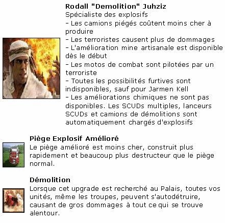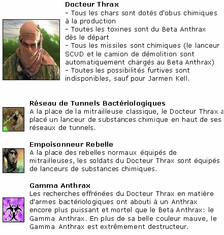 Saboteur : Unité totalement furtive, le Saboteur peut escalader les falaises. Infiltrer un bâtiment ennemi sera un jeu d'enfant pour lui, d'autant plus que si il infiltre un centre de commandement, les pouvoirs de général possédant un compte à rebours sont réinitialisés.