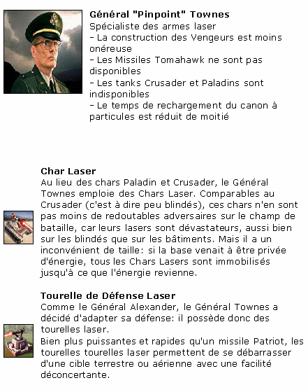 Vengeur : Humm-Vee modifié, le Vengeur permet de marquer une cible terrestre à l'aide d'un laser, donnant cadence de feu plus rapide et dégâts plus importants aux unités visant la cible. Le vengeur peut aussi très rapidement descendre toute unité aérienne avec 2 lasers très puissants.