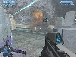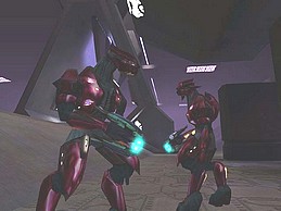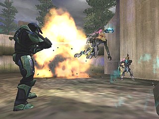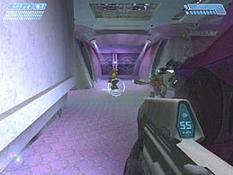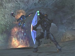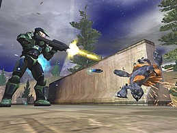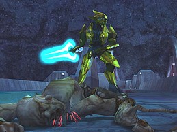 Le gameplay![]() Un tel scénario, bourré de rebondissements et plutôt riche en personnages (le résumé précédent en élude plusieurs), aurait pu rendre Halo très narratif, riche en cinématiques et dialogues. Il n'en est rien : 90% du temps de jeu est occupé par des combats. Pour le reste, si des phases d'exploration émaillent les premiers niveaux, elles disparaissent dès que toute la vérité sur le Halo est connue. À partir de là les évènements se précipitent et les ennemis affluent de toutes parts. Quant aux cinématiques (utilisant le moteur graphique du jeu), elles n'interviennent qu'au début et à la fin de chaque niveau, et occasionnellement au milieu. Cortana et 343 Guilty Spark font la plupart de leurs commentaires pendant des phases de jeu effectif, c'est à dire pendant des combats, leur voix étant alors couverte par les explosions, tirs et cris de douleur en tous genres. C'est franchement regrettable, vue la densité d'informations importantes qui sont alors divulguées. De même, les niveaux étant très longs (au minimum 1 à 2 heures de jeu) et conçus pour provoquer une tension nerveuse qui va crescendo, on aura tendance à se relâcher lorsqu'on les termine, et ne pas faire très attention à la cinématique qui suit. Finir le jeu deux ou trois fois ne sera donc pas de trop pour bien saisir tout ce qui s'est passé. ![]() ![]() Halo a clairement été conçu pour proposer des phases de combat comme on n'en avait jamais vécu dans un FPS sur console, dans le cadre d'un jeu dont la dimension épique repose, outre le scénario, sur une mise en scène parfaitement maîtrisée. Pour que tout fonctionne, les développeurs sont allés droit au but et n'ont pas hésité à rompre avec les habitudes du genre. Les ennemis![]() ![]() Les ingrédients sont les mêmes que dans Half-Life : le joueur affronte deux ethnies au comportement radicalement différent, l'une très tactique, l'autre agissant en force. Mais Halo va bien plus loin que le hit de Valve dans les combinaisons que permet cette association. Les Covenants, que l'on rencontre tout au long du jeu, regroupent comme on l'a dit plusieurs races extra-terrestres. Ils se comportent à peu près comme des humains pendant les combats, et donc on pourra utiliser leurs armes (eux, par contre, méprisent les pétoires humaines). Leur technologie est plus futuriste que celle des Hommes, mais leurs équipements ont des défauts qu'il faudra contourner. Les Covenants sont de quatre sortes : - Les Grunts : ce sont des soldats de petite taille, toujours présents en grand nombre et redoutables au pistolet plasma. Les Grunts s'expriment en langage humain, mais avec une voix ridicule (lhistoire nous apprendra que c'est à cause du méthane sous pression qu'ils respirent). Leurs interventions sont hilarantes, car ils sont très bavards, tantôt lâches et défaitistes ("ils me cernent !", "ils sont partout !"), tantôt provocateurs et haîneux ("je te tire dessus ! «, "je ne t'aime pas !", "je te hais", "je te blesse !"), ce qui nuit à leur furtivité. Groupés ils sont dangereux, mais dès qu'ils voient plusieurs de leurs semblables mourir, ils perdent confiance. Ils ont aussi une fâcheuse tendance à s'endormir (à moins qu'il s'agissent d'une sorte de méditation) lorsqu'ils montent la garde, ce qui est pratique pour le Master Chief qui est capable de les tuer d'un coup de crosse. Les Grunts tirent en général au pistolet à plasma, un arme fort efficace par son autonomie et sa capacité à tirer des charges cumulées très puissantes. Vers la fin du jeu, on en rencontre toutefois qui utilisent une sorte de lance-roquettes. ![]() ![]() - Les Elites : ces malabars entrent à coup sûr dans le top 10 des ennemis les plus redoutables rencontrés dans un FPS. L'Elite mesure environ 2m50, et il est équipé d'une armure à rechargement automatique comparable à celle du Master Chief dans son fonctionnement et son efficacité. Il tire au fusil à plasma, arme redoutable mais qui surchauffe en cas de rafales répétées. L'Elite esquive et sait contourner discrètement l'ennemi. Il peut piloter des véhicules et commander des troupes. Du reste, lorsqu'on le tue, les Grunts qui l'accompagnaient s'enfuient en hurlant "Le chef est mort !", une des répliques les plus célèbres du jeu. Les Elites poussent des grognements ("whort whort !") qui finissent par faire sursauter de peur tant on les sait annonciateurs d'un combat difficile. Les plus gradés, nommés Elite Commander, utilisent des modules d'invisiblité temporaire, ainsi qu'un sabre laser redoutable (seule arme Covenant que le joueur ne pourra pas utiliser), et chacune de leurs apparitions se solde par un moment très difficile. À noter que le Master Chief, grâce à son armure, fait jeu égal avec un Elite sur le plan de la force physique, ce qui permet de furieux corps-à-corps lorsque les munitions viennent à manquer.