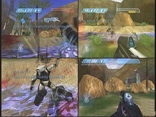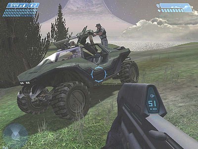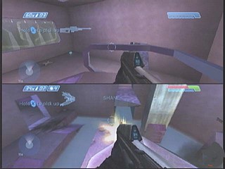 Maniabilité, HUD et armureTout comme des jeux comme Goldeneye 64, Perfect Dark ou Metroid Prime, Halo est un FPS qui se joue parfaitement au pad. Tout le problème réside habituellement dans la gestion de la visée. Une souris permet d'orienter celle-ci dans la direction voulue instantanément et avec précision, tandis qu'au pad il faut attendre que la vue tourne, et la stopper au bon endroit n'est pas toujours aisé. Halo résout ce problème par sa visée automatique, son level-design et la conception de l'armure du Master Chief. ![]() Les réticules associés aux différentes armes, élargis pour pallier à l'imprecision de la visée au pad, sont conçus comme dans n'importe quel FPS sur console. En revanche l'armure à rechargement est une idée totalement nouvelle dont l'efficacité est déterminante : une jauge indique son taux de protection, et une autre l'énergie vitale du héros. Lorsqu'il est touché plusieurs fois, la jauge de protection descend. Il suffit alors de se mettre à l'abri, et au bout de quelques secondes elle remonte au maximum. Le rythme des combats n'en est pas affecté, car ce sont la plupart du temps des fusillades lors desquelles on doit se cacher très souvent. Si la jauge de protection est à zéro et qu'il continue d'être touché, le Master Chief perd très vite son énergie vitale, et meurt. Avec un tel système, recevoir quelques coups par surprise est sans conséquence, et on cesse de pester contre cette visée qui fait perdre du temps. On s'y habitue alors très vite. La vitesse de déplacement des ennemis (notamment les infectés, qui encerclent souvent le joueur), leur fréquence de tir et la difficulté du jeu sont parfaitement calibrés pour que l'on ne se sente pas handicapé. Et si la bataille prend une mauvaise tournure, les grenades permettent de déblayer le terrain. En dernier recours, le corps-à-corps à coups de crosse se révèle très efficace (et fun !), devenant même une donnée primordiale dans les niveaux de difficulté les plus élevés, où le manque de munition est très fréquent. En dehors des deux sticks analogiques, qui gèrent déplacement et visée, le pad Xbox d'origine semble avoir été inventé pour Halo. Bungie a fait un autre choix audacieux pour que tout se passe bien : le Master Chief ne peut porter que deux armes à la fois. Finis les inventaires bourrés de pétoires en tout genre que l'on fait défiler sans cesse. Sachant qu'en plus les munitions sont chichement attribuées, cela oblige à une grande rigueur dans ses choix, et la capacité de s'adapter. Pour finir sur le HUD, signalons que celui-ci peut, dans certains cas, donner une information de cap et distance jusqu'au prochain objectif. C'est très utile, car on se perd assez facilement. Modes multi-joueur, coopératif, difficulté![]() Sur une seule console il est possible de jouer tous les niveaux de la campagne solo à deux joueurs, en écran séparé. Ce mode, hérité de Marathon 2, est génial, sa responsabilité dans le succès de Halo est inestimable. Le deuxième joueur incarne alors un autre SPARTAN, dont la présence au niveau du scénario n'est que virtuelle mais qui est bien là dans l'action. Les limitations au niveau des armes transportées, ainsi que leur complémentarité trouvent alors tout leur intérêt, et le moteur 3D suit le mouvement sans trop de problème. On se régale à élaborer des stratégies d'attaque à deux, jouant tantôt très près l'un de l'autre pour se couvrir mutuellement, tantôt séparés. Les passages les plus mémorables de l'aventure prennent alors une autre dimension, surtout si on y utilise le Warthog. Il faut préciser que la progression dans chaque niveau est délimitée en points de contrôle, qui sont autant d'endroits où l'on peut sauvegarder la partie. En mode coopératif, deux problèmes viennent se poser : on ne peut pas sauvegarder les points de contrôle (il faut impérativement terminer le niveau en cours avant d'éteindre la console, ce qui implique d'avoir pas mal de temps devant soi), et si le joueur 1 franchit un point de contrôle, le joueur 2 est téléporté près de lui. D'autre part, si un des deux joueurs meurt, il devra attendre que son compagnon ait nettoyé la zone d'une bonne part de ses ennemis avant d'être ressuscité. Parfois, cela peut prendre plusieurs minutes, à moins de battre en retraite vers un endroit plus calme. ![]() Que l'on joue seul où en coop, 4 niveaux de difficulté sont proposés, accompagnés d'un commentaire qui en décrit les modalités. Je n'ai pas essayé le mode Facile, car le mode Normal est déjà bien accessible. Il permet de débloquer les 10 niveaux de la campagne solo, pour pouvoir les rejouer dans l'ordre voulu, revoir tranquillement les moments-clés du scénario et expérimenter à l'envie. Pour assouplir encore plus les choses, il est possible de changer le niveau de difficulté n'importe quand. Les deux plus élevés, baptisés Héroïque et Légendaire, proposent un défi à la hauteur des hardcore-gamers, mais la dimension tactique du jeu se révèle alors totalement : outre le fait que Master Chief meurt très vite, le bouclier des Elites se recharge en quelques secondes, obligeant à utiliser des combinaisons de deux armes et perfectionner ses lancers de grenades. Il convient donc de terminer (au moins en partie) le jeu dans les 4 niveaux pour vraiment observer le travail accompli par Bungie. Halo ne possède pas de fonctionnalité Xbox-Live, ce service n'ayant été lancé qu'un an et demi après sa sortie. Par contre pour le jeu en réseau local (appelé sur Xbox "System Link"), il répond présent. Il n'est hélas pas possible de faire la campagne solo en coopératif sur deux consoles, mais de véritables modes multi-joueurs du style Deathmatch/Capture the Flag sont proposés, avec des maps spéciales qui peuvent se pratiquer sur un réseau de 4 consoles accueillant chacune jusqu'à 4 joueurs en écran séparé. La partie multi-joueurs