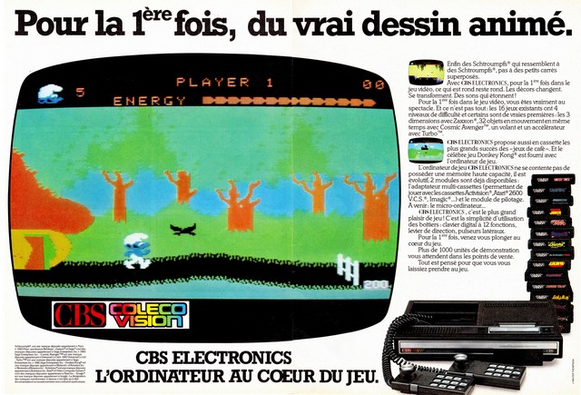 À cette époque, et encore plus pour les fêtes de fin d'année, c'était la ruée. Je me rappelle particulièrement bien de la FNAC de Clermont-Ferrand, qui alignait deux consoles Coleco à côté d'autres marques. On y voyait deux jeux et on pouvait surtout y jouer : Zaxxon et les Schtroumpfs. Moi qui avais 13 ans à l'époque, je préférais m'éclater à Zaxxon : je trouvais que les Schtroumpfs c'était pour les mômes... Mais quand la console était libre, j'y jouais quand même, debout dans la salle, avec plein de gens qui regardaient... C'était chouette ! La marque CBS proposait des publicités dans les journaux, et misait sur trois jeux pour doper les ventes : Zaxxon avec sa 3D, Turbo et son volant, les Schtroumpfs aux graphismes si jolis. La voici :