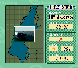 Si Shigetaka Kashiwagi et sa moustache ne vous ont pas charmé, laissez vous mener en bateau par Masaki Shimono qui sponsorise le soft de pêche ici présent mais ne semble pas y apparaitre. Après avoir choisi un avatar dont les caractéristiques changeront en fonction de son âge, on va dans un magasin ou il faut acheter tout son équipement (hameçons, appats, canne à pêche ... et même des accessoires comme une casquette ou un gilet !). Puis on choisit sa destination sur la carte d'un lac et un petit film digitalisé en noir et blanc montre notre bateau s'y rendre. Ensuite c'est du classique : choix de l'endroit ou lancer son hameçon (en s'aidant d'un sonar), jet avec barre de puissance comme dans un jeu de golf, et vue splitée avec le pêcheur au dessus et une représentation imagée du fonds sous-marin en dessous. On déplace alors son hameçon avec un bouton en espérant qu'un poisson vienne mordre ... Mais quel poisson ? Je n'en ai vu aucun pendant mes quelques tentatives à jouer à ce titre. Bah, tant pis : les graphismes ne sont de toute façon pas bien folichons dans l'ensemble. L'interface est de plus entièrement en japonais, ce qui ne facilite pas les choses.