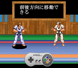 Les modes de jeu présents permettent d'affronter le CPU ou un joueur humain lors de tournois en solo ou par équipe. Il y a aussi un tutorial et on peut également créer un perso et lui attribuer des points dans divers caractéristiques et également choisir ses coups, mais l'interface n'est pas très claire et la langue pose un peu problème évidemment. A ce propos, notons l'effort de Human qui propose tous les textes à l'écran non seulement en japonais, mais aussi en ... coréen ! Bon, OK, ça ne va pas avancer grand monde ici ! La réalisation est moyenne, manquant un peu de couleurs, sans effets tape-à -l'oeil ni exploits techniques notables, avec des sprites assez grands et des animations lisibles et fidèles à la réalité quoi que manquant un peu d'étapes et de fluidité. En tout cas ça bouge bien et les commandes répondent sans problème.
