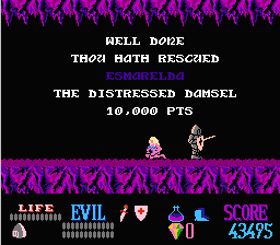Après avoir eu de mauvaises premières impressions, j'ai finalement pu m'y mettre et le finir. Il s'agit du premier volet de la série Wizards & Warriors, qui compte deux autres épisodes sur NES (Ironsword et Kuros, Visions of Power, voir article de JC sur la boîte Zippo Games) et un volet Game Boy (Fortress of Fear, voir article de Tonton Ben). (belle musique d'intro ressemblant un peu à du Bach) En fait, le jeu est facile à ma grande surprise, c'est le jour et la nuit par rapport à Battletoads. Pour ceux qui ne le savent pas, c'est un jeu d'action/aventure/plate-forme où on dirige un chevalier parti libérer plusieurs femmes en détresse jusqu'à arriver au château d'un sorcier détenant une princesse.