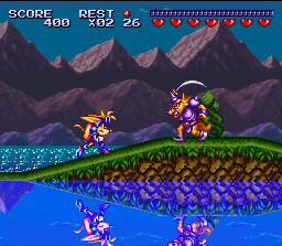 Suite du formidable "Rocket Knight Adventures" sur Megadrive, Sparkster est un excellent jeu de plate forme qu'on doit aux artistes de Konami qui réalisent là, à mon avis, leur plus belle réalisation dans le genre. L'animal qu'on dirige, un opossum, doit traverser des niveaux proposant un level-design inventif qui renouvelle régulièrement le gameplay, et qui se terminent bien entendu par un boss. La particularité du héros provient de son jet-pack qui lui permet, lorsqu'on laisse appuyé le bouton de tir, de s'élancer comme une fusée, épée en avant, dans n'importe quelle direction, tout en rebondissant sur les murs ou en les détruisant parfois pour trouver des objets cachés. Celà lui permet aussi d'éliminer ses ennemis mais ce n'est pas la seule attaque dont il est capable : il peut en effet frapper avec son épée qui déchire l'air devant lui et touche les ennemis à distance, et les boutons L et R lui font effectuer une roulade très rapide idéale pour se sortir d'une situation critique ou l'on est encerclé. On peut bien entendu également sauter. Toute l'architecture des niveaux tourne intelligemment autour des capacités du héros et le rythme très soutenu de l'action, parfois comparable à celle d'un "run and gun" à la Contra dans certaines sections, met continuellement le joueur sous pression. Les situations sont variées avec par exemple une section de niveau ou on se déplace sur un robot autruche, une phase ou on doit échapper à un torrent qui remplie les décors et menace de nous noyer, ou encore un niveau complet qui est en fait un shoot-them-up vertical. Sparkster est varié et extrèmement jouable, bien rythmé et amusant, et il est également très bien réalisé avec un design réussi, des graphismes beaux et colorés, et une bande son culte avec cette fameuse musique qui reste dans la tête. Du très grand Konami pour petits et grands, à pratiquer sans retenue. A noter qu'il existe une version Megadrive qui est totalement différente : autre architecture des niveaux, autres décors, autres ennemis et une jouabilité modifiée. Le jeu a également connu un remake sur consoles HD, et le résultat n'est malheureusement pas à la hauteur de l'original. Excellent Je ne m'étend pas plus sur ce chef d'oeuvre, allez (re)lire l'article de Bruno pour plus de détails : http://grospixels.com/site/sparkster.php