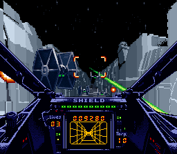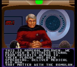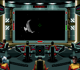 Dans ce 1er jeu Snes tiré de la célèbre saga de science fiction Star Trek, on incarne un jeune capitaine qui doit faire ses preuves, d'abord à l'aide d'un simulateur, puis en se voyant confier de nombreuses missions à bord de différents vaisseaux. L'habillage du jeu est très réussi et rappelle un peu les jeux Wing Commander : on se trouve dans une base spatiale ou il nous est possible de discuter avec les membres de son équipage entre les missions et ainsi apprendre à mieux les connaitre, ou bien de consulter divers documents à propos du monde de Star Trek, et enfin de participer aux briefings des missions (ou on peut même poser des questions). Une fois aux commandes de son vaisseau, on passe à une vue de l'espace à la première personne dans laquelle planètes, vaisseaux alliés ou ennemis, météorites et autres débris sont représentés par des objets 3D assez simplistes (les vaisseaux Klingons ou Romuliens sont certes moches mais reconnaissables ...). On peut alors accélérer avec X, ralentir avec B, et utiliser ses armes avec A et Y. En appuyant sur SELECT, on accède à un menu nous permettant d'utiliser diverses fonctions : communications, règlage du radar, réparations, carte de navigation, activation du rayon tracteur pour récupérer certains objets perdus dans l'espace ... etc ... Les missions, assez bien scénarisées, nous demandent d'explorer certains secteurs en quête d'indices, de trouver par nous même la prochaine destination, de combattre, de récupérer des objets (avec les rayon tracteur) ... etc ... En plus de ces missions qui s'enchainent et racontent une plus grande histoire, on peut accéder à des missions spéciales retraçant des batailles issues de films ou épisodes TV de la saga (on reçoit alors des ordres du capitaine Kirk !). Un affrontement purement action à 2 joueurs en écran splité est également possible. Tout celà est bien joli et donne envie le temps de se familiariser avec les quelques premières missions. Mais rapidement, l'expérience tourne au cauchemard : les combats sont en effet indigestes. On se déplace trop lentement et on passe son temps à tourner sur nous même en espérant voir l'ennemi apparaitre devant sois. Et puis à partir d'un moment, le fait de devoir passer sans arrêt par une série de menus pour changer la portée de son radar ou accéder au rayon tracteur devient franchement pénible. Enfin, il faut souvent naviguer très longtemps dans l'espace infini ou il ne se passe rien avant d'arriver à sa destination. C'est vraiment dommage car le jeu avait de quoi plaire. Mediocre