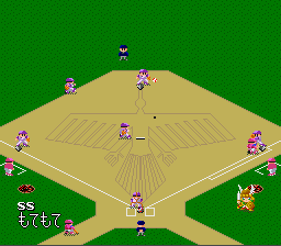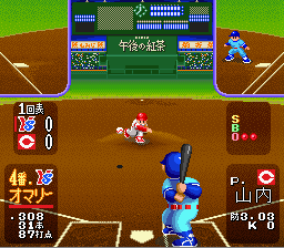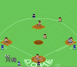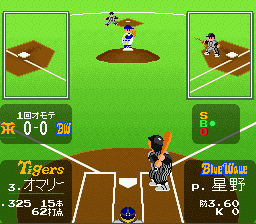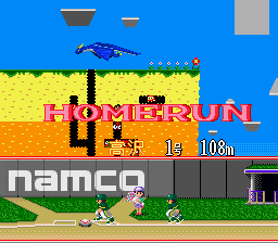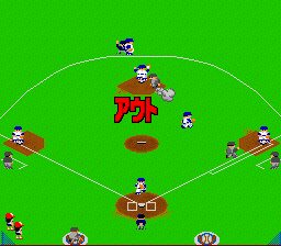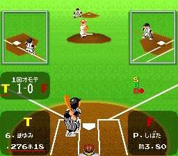 Difficile de faire plus classique que ce jeu de baseball à la réalisation graphique très sommaire. Vue de derrière pour le batteur lors des lancers, vue de dessus pendant les phases de récupération, et jouabilité ultra-simple avec un bouton et une direction pour toutes les actions possibles. C'est parfaitement maniable, le CPU a un bon niveau, la vitesse de jeu est bonne et on s'amuse sans problème. Sauf que le titre de Namco est noyé dans la masse des jeux du genre sans rien qui lui permette de se distinguer. Pas de design original, très peu d'options, aucune licence. Si, il y a bien des petites animations lors des homeruns et tout un tas de musiques (issues d'air populaires) qui retentissent suivant la situation de jeu (suivant le nombre de joueurs sur des bases alors que le batteur s'apprête à frapper). Mais à part ça, RAS. Et comme la réalisation n'est pas fabuleuse, il n'atteind pas vraiment le haut du panier. Attention, le jeu ne démarre pas sous certains émulateurs. Moyen Super Famista (Namco - 1992)