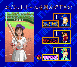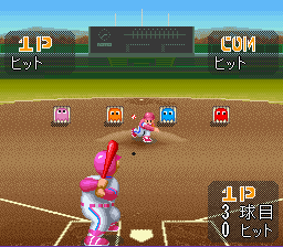 Du neuf dans cet épisode. Déjà un moteur graphique légèrement revu avec des sprites plus gros, de nouvelles animations et plus de couleur. Ensuite plein de nouvelles options avec pas moins de 10 stades différents par exemple. Il y a surtout un nouveau mode "test" constitué de 5 ou 6 mini jeux assez amusants ou il faudra courir le plus vite possible (martelage de bouton), lancer le plus loin possible, abattre des cibles ou faire un maximum de homeruns. Très sympa. Mais ce que je préfère dans ce jeu c'est de pouvoir jouer avec des équipes Namco dans un stade spécial tout à la gloire de l'éditeur ou les clins d’œils à des jeux comme Pacman, Dig Dug ou Xevious abondent, sans parler des musiques délicieusement "chip-tunes". Accessoirement ce stade est également plus petit et permet de réaliser plus facilement des homerun. Le gameplay quand à lui n'a pas changé et est toujours aussi amusant qu'abordable. Un jeu de baseball vraiment sympathique. Bien Super Famista 5 (Namco - 1995)