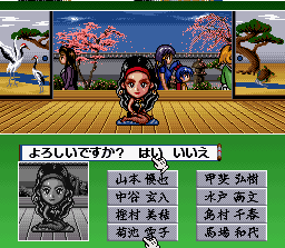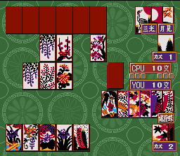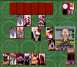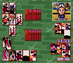 Super Hanafuda est finalement moins "Super" que "Hanafuda" tout-court (vu en page 48). Il s'agit bien entendu ici aussi d'un jeu de cartes japonais (le Hanafuda donc) mais sans fioriture et avec peu d'options. On dispute des parties libres en choisissant son adversaire ou bien on dispute un tournoi. Le graphisme des cartes manque un peu de finesse mais elles restent lisible. De petites animations aparaissent parfois en pleine partie, dans une petite fenêtre, montrant l'adversaire réflechir ou jubiler après un bon coup. Super Hanafuda 2 (Imax - 1995)