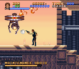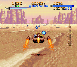 Tiré du premier film de la saga "La Guerre des Etoiles" (si si, on disait comme ça avant ^^), ce jeu est un titre d'action proposant de nombreux niveaux et suivant de façon très libre l'intrigue du long métrage. La plupart du temps, on dirigera Luke Skywalker vu de coté dans des phases d'action / plate-forme ou il doit avancer jusqu'au boss en tirant dans toutes les directions avec son blaster ou en taillant dans le lard de ses ennemis avec son sabre laser (pas disponible dans les premiers niveaux). Luke peut également sauter à la Super Metroid (deux types de sauts avec plus ou moins d'amplitude) et faire des glissades. Plus tard dans le jeu, ces phases seront jouables avec d'autres héros du film qui se dirigent de la même façon. Certains niveaux présentent un gameplay différent avec des phases ou on dirige un véhicule vu de derrière dans des décors animés en fausse 3D, l'un des derniers niveaux nous mettra également aux commandes d'un X-Wing avec vue subjective comme dans l'ancêtre des jeux Star Wars en arcade. Le jeu propose une action soutenue dans ses phases principales avec des ennemis en grand nombre arrivant de tout cotés, inlassablement, et qu'on dégomme dans la bonne humeur à coup de blaster. Ce rythme effréné est la grande force du jeu car les niveaux ne proposent pas d'exploration et les phases de plate-forme souffrent de quelques défauts qui les rendent souvent pénibles : on est victime du syndrome "je passe à travers la plate-forme quand je m'approche du bord pour mieux sauter". L'autre problème du jeu, mais c'est plus subjectif, concerne le manque d'intérêt des phases en landspeeder : longues et difficiles, elles sont victimes d'un gameplay approximatif alors qu'on doit éliminer un nombre imposé d'ennemis et se diriger vers un objectif en gérant sa vie et son carburant et en étant, encore une fois, assaillis d'ennemis venant de tous cotés. Le soucis est que ces derniers sont largement moins amusants à occire que dans les phases vues de profil, et on n'a qu'une hâte : que ces niveaux mal fichus se terminent. Malgré ces défauts, le jeu est très plaisant. Il faut dire que la licence fait beaucoup avec ses lieux connus de tous les fans (la planète des sables, l'étoile de la mort ...), ses musiques tirées du film, et ses petites cinématiques entre les niveaux. La réalisation est dans l'ensemble satisfaisante avec des sprites assez jolis et reconnaissables, et la séquence en X-Wing est impressionnante. Le jeu n'est pas d'une fidélité absolue et ajoute de nombreux ennemis inédits : monstres mutants, ou robots géants, pour le plaisir du joueur. Au final, Super Star Wars est un jeu d'action prenant et difficile (mais pas trop dans les 3/4 du jeu en "easy"). On peste contre lui en tombant dans un précipice à cause d'une maniabilité un peu approximative, mais on y revient pour canarder dans tous les sens sur la musique de John Williams. Bien (si on est fan de la trilogie, assez bien seulement sinon)